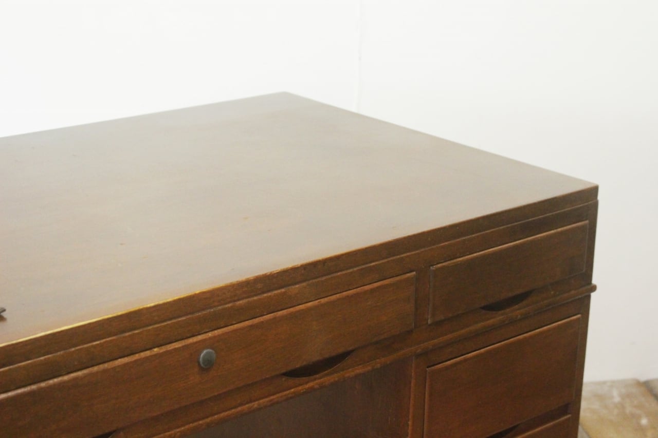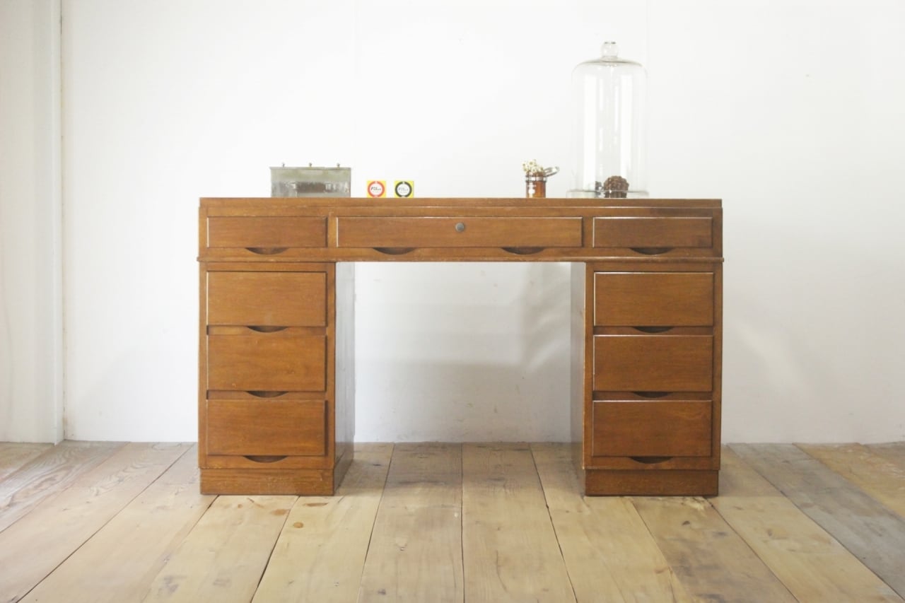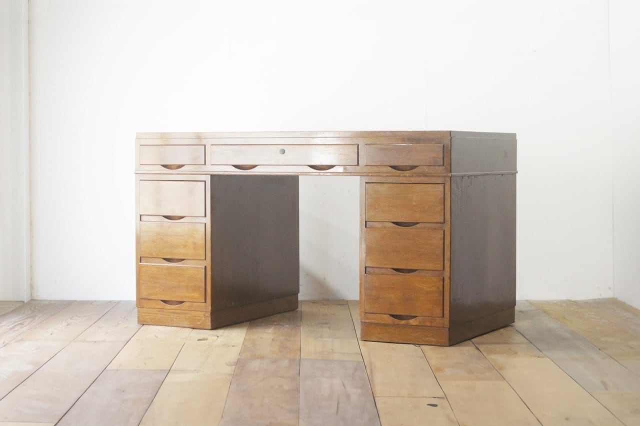 レトロ 両袖デスク 机 書斎 作業台 引き出し 抽斗 9杯 分割可能 木製 古道具 ヴィンテージ/PFT17120