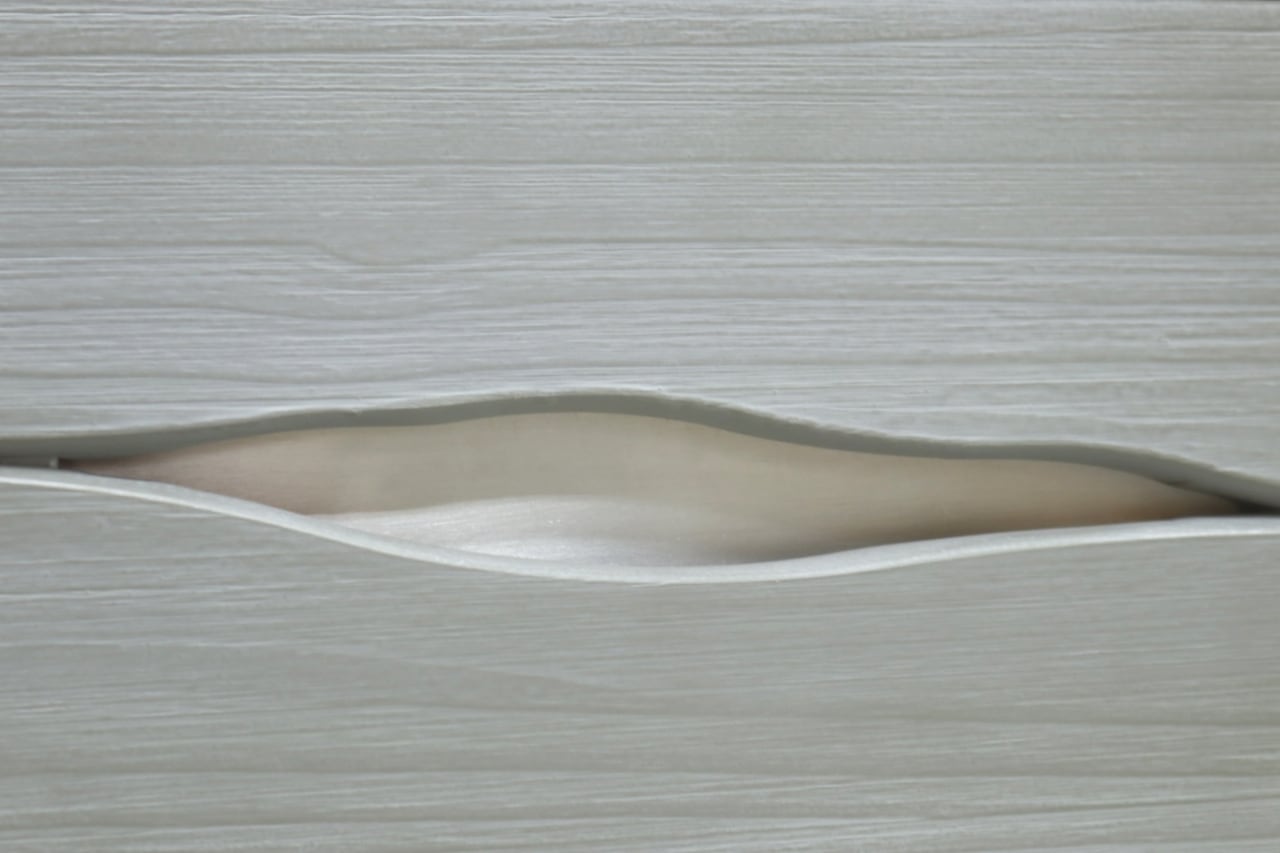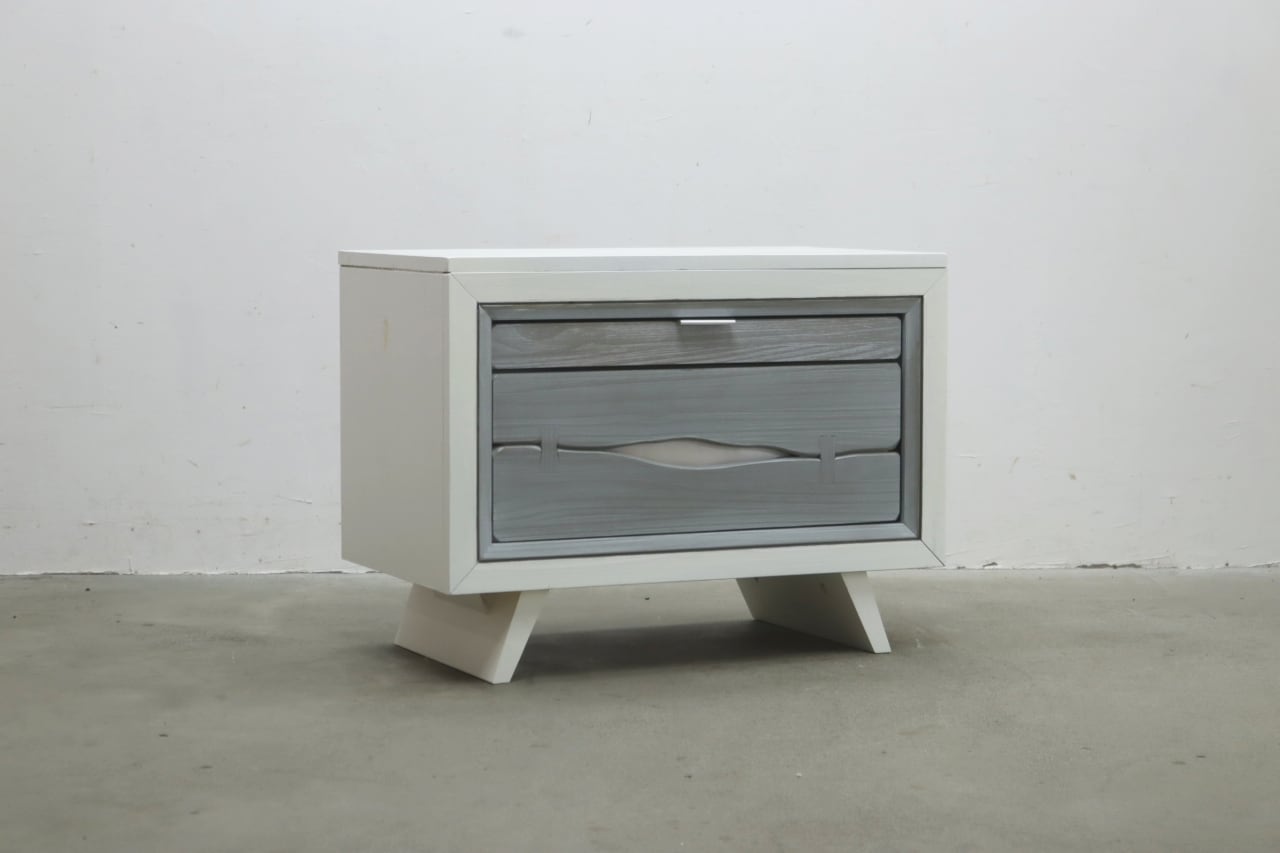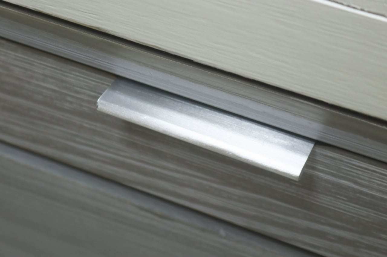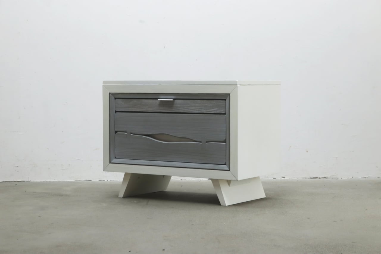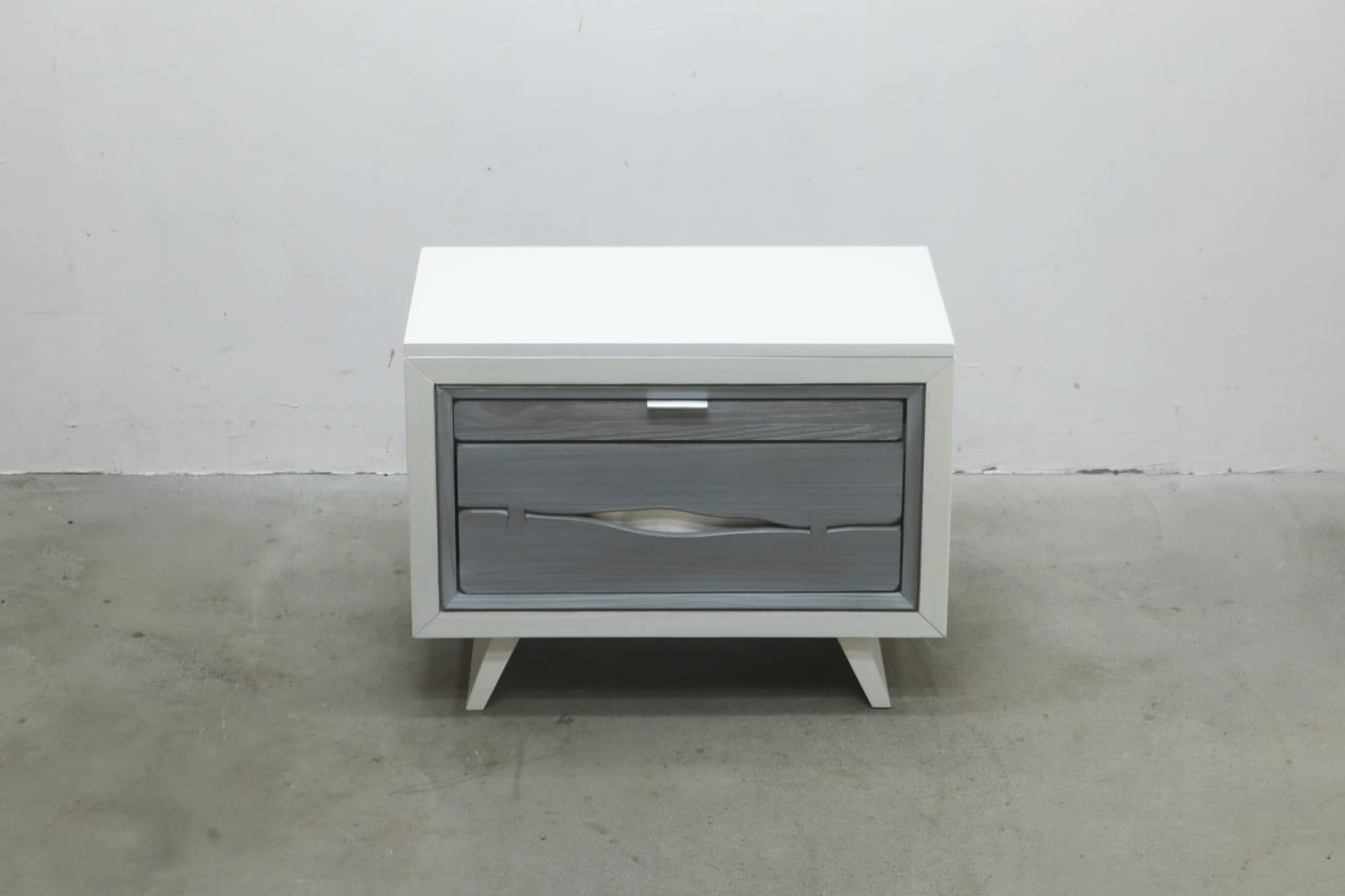 本体はホワイトを基調とし、引き出し前板にはグレーの木目調パネルを使用。