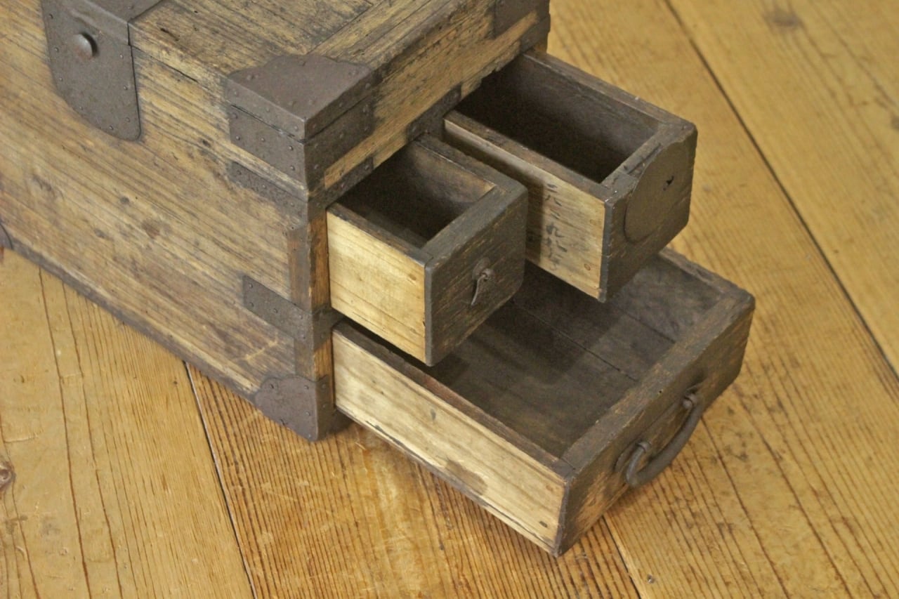 レトロ 明治 懸硯 船箪笥 小引き出し 硯箱 抽斗 3杯 時代物 すずり たんす 無垢材 木箱 古道具 ヴィンテージ/PHK20144