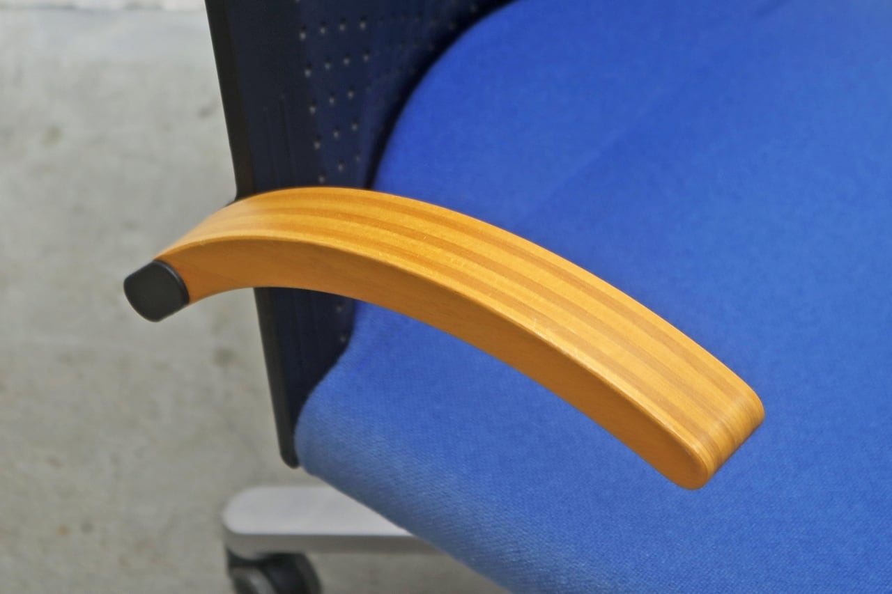 青いファブリックと木製アームを組み合わせたポップなカラーリングが目を引きます。