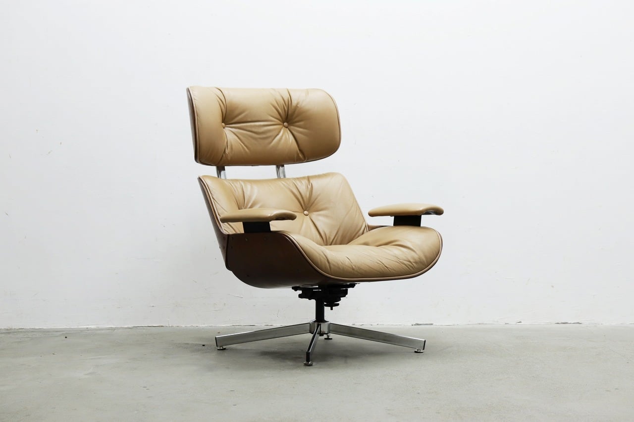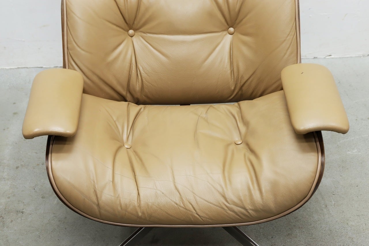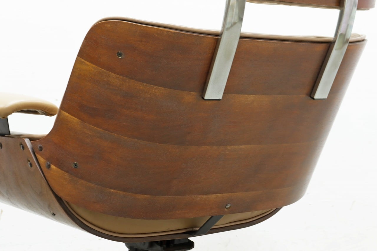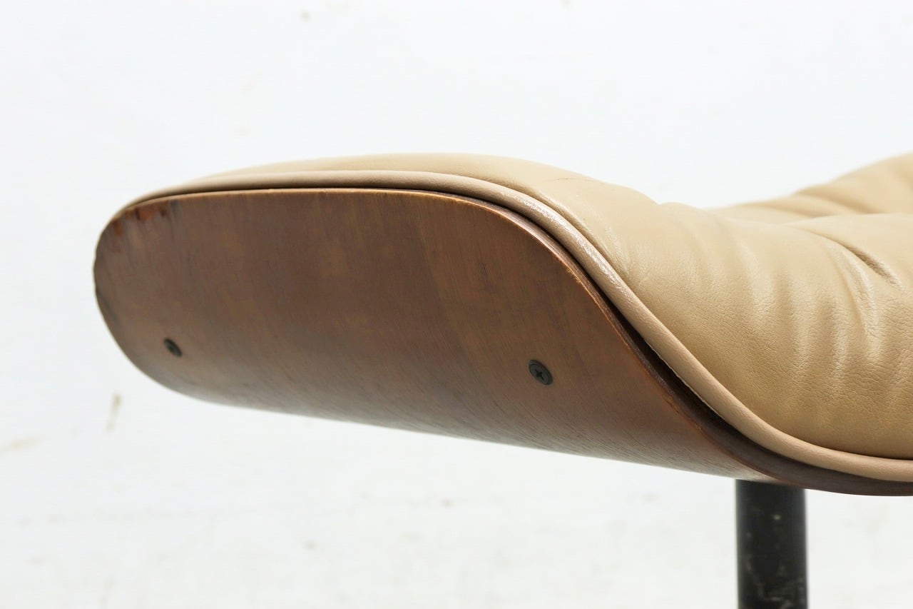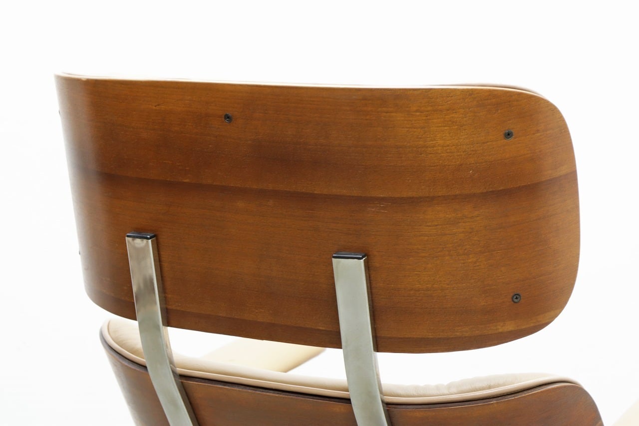 ヘッド、背もたれ、シートと3つのセクションに分かれたクッションや、本体を覆う様に湾曲したプライウッドのフレームなどイームズラウンジチェアによく似たデザイン。
