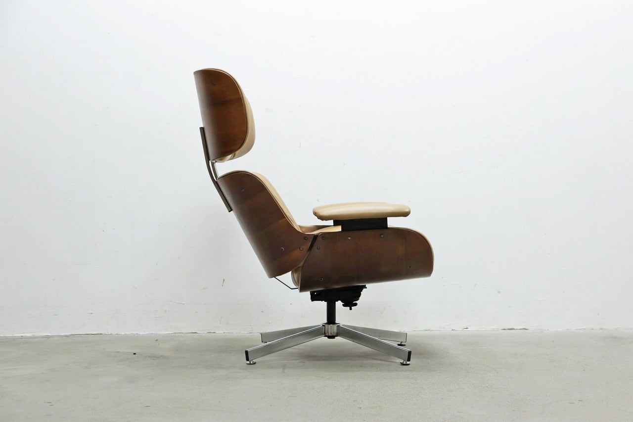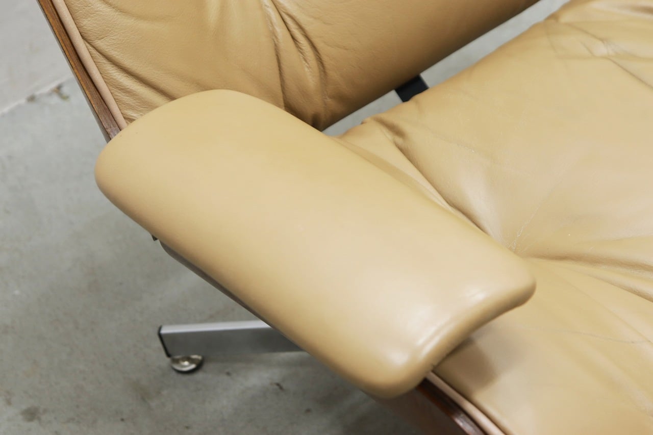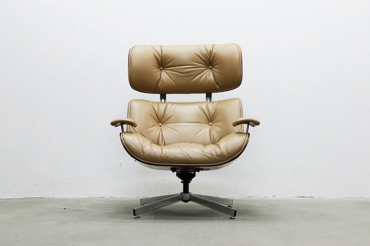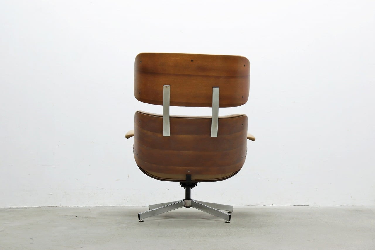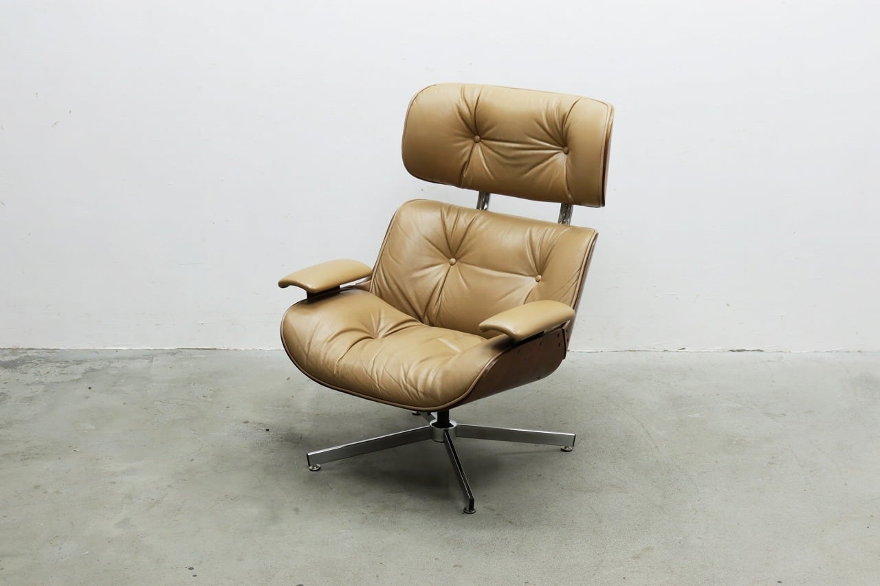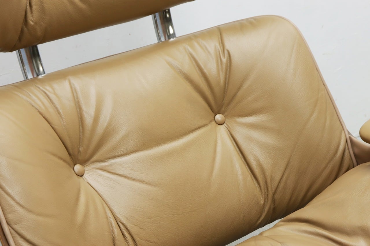 ヘッド、背もたれ、シートと3つのセクションに分かれたクッションや、本体を覆う様に湾曲したプライウッドのフレームなどイームズラウンジチェアによく似たデザイン。
