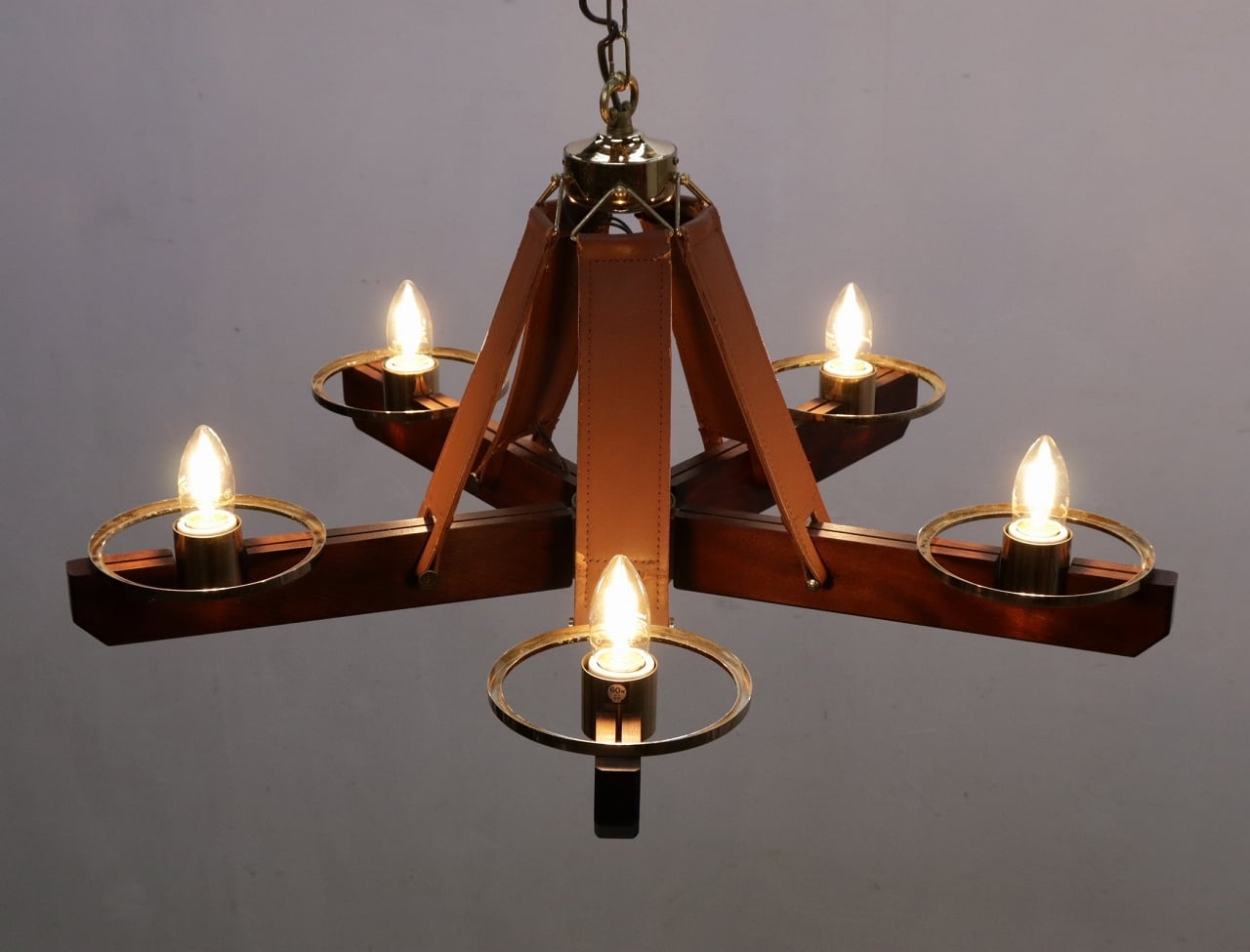 ヴィンテージ 5灯 木製 本革 シャンデリア 照明 ペンダント ライト ランプ アンティーク PIT23165