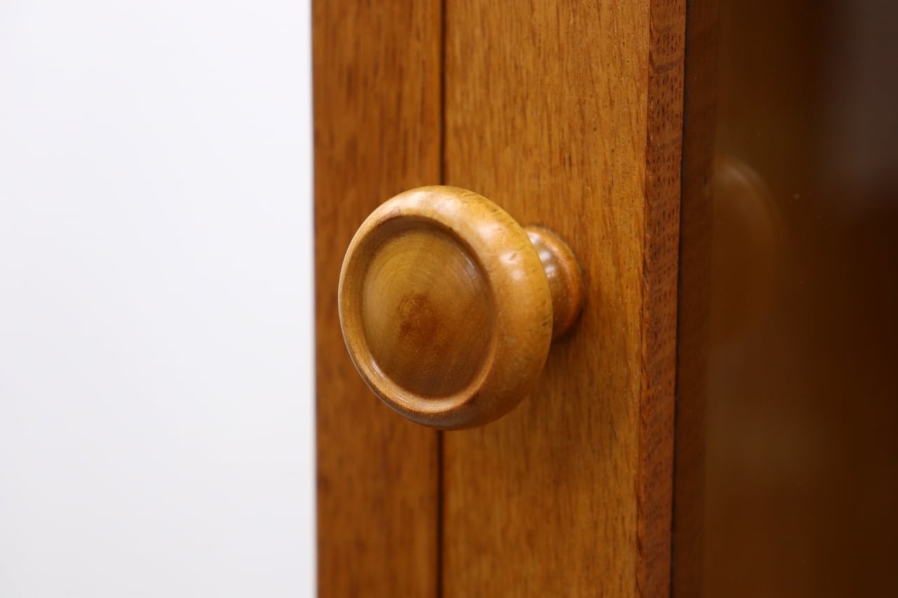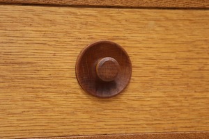 色味の異なる丸くくりぬかれた無垢材の取っ手が印象的。