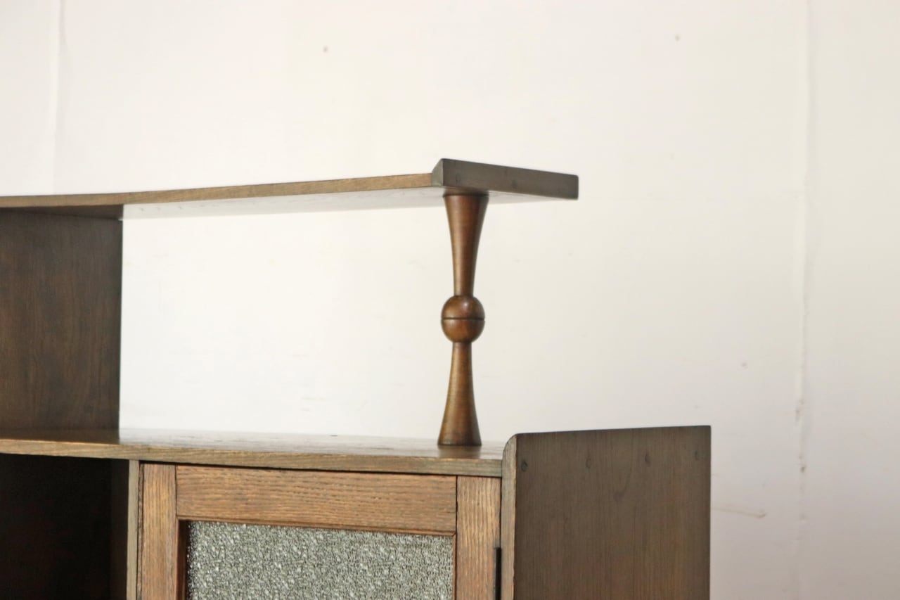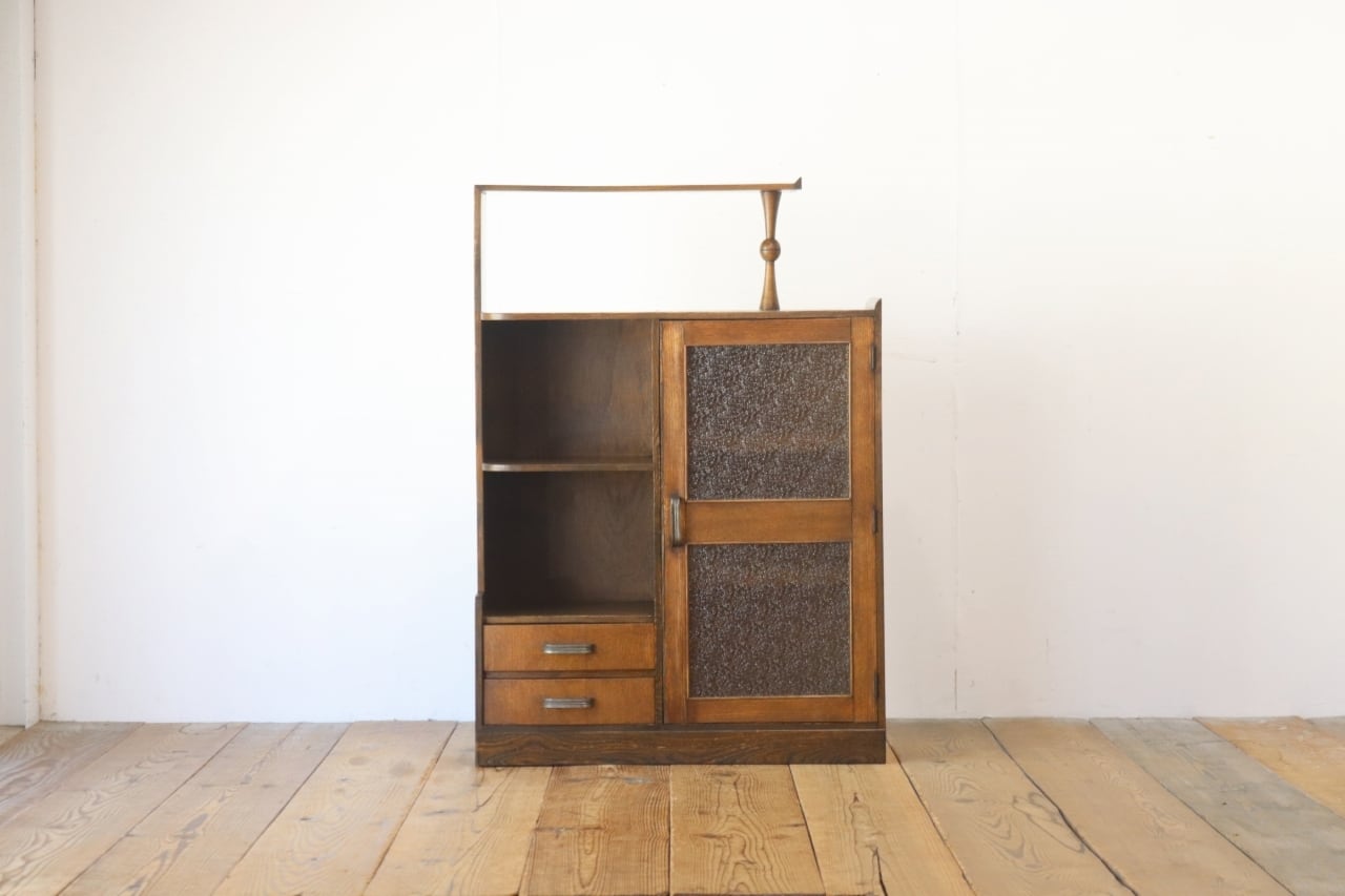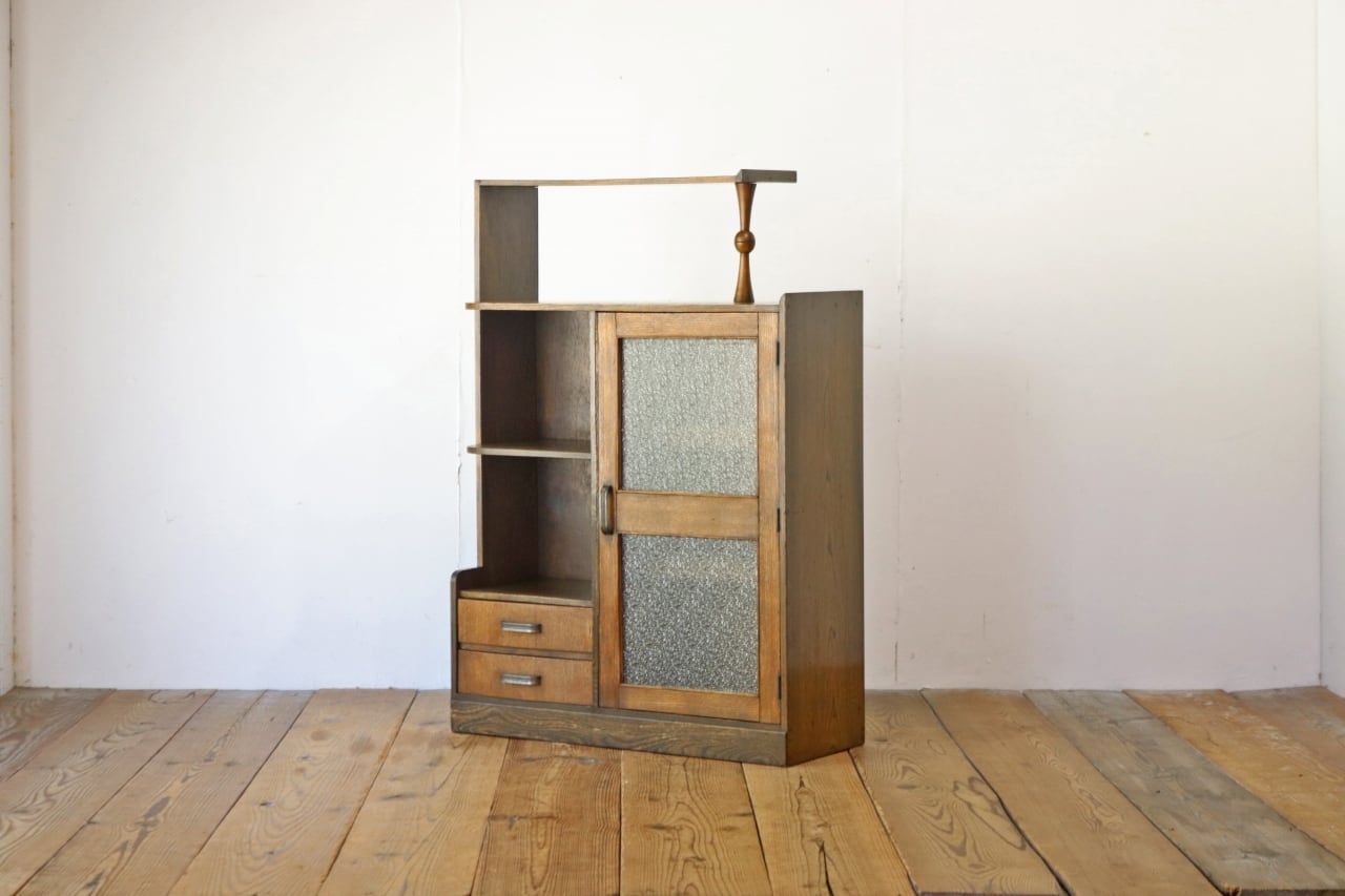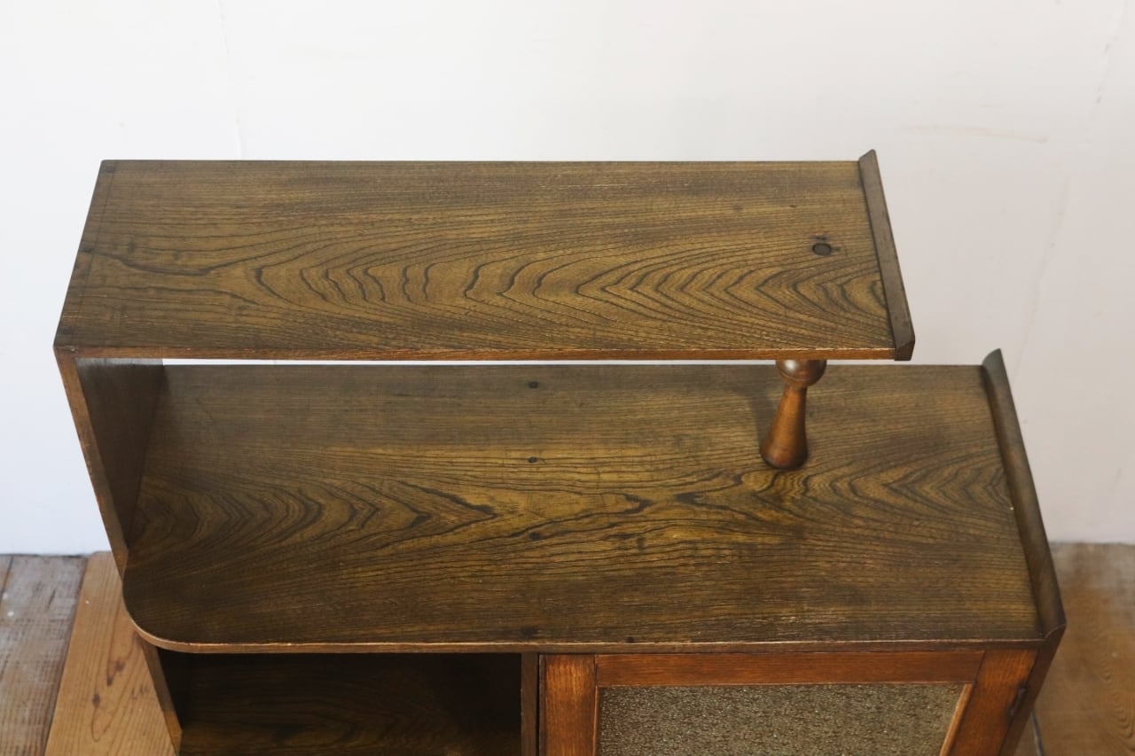 レトロ 小振り 飾り棚 ガラスキャビネット 収納 本箱 左右非対称 木製 ダイヤガラス 昭和 ヴィンテージ/PHK05036