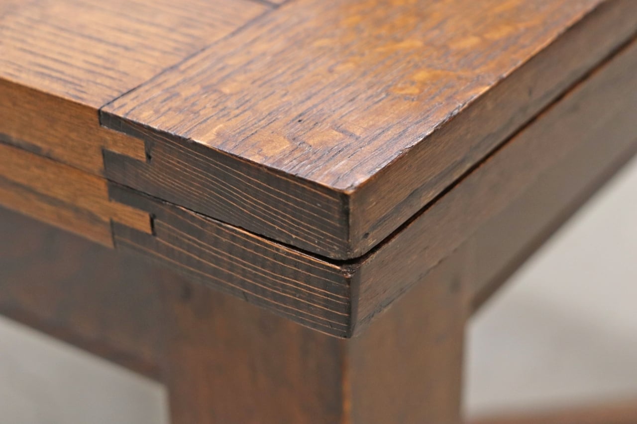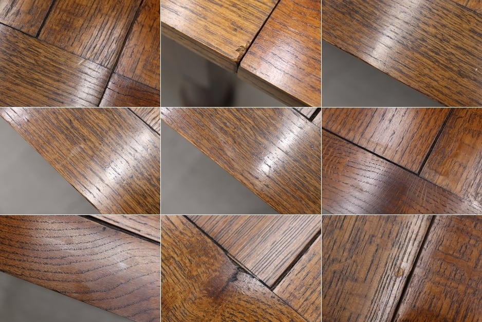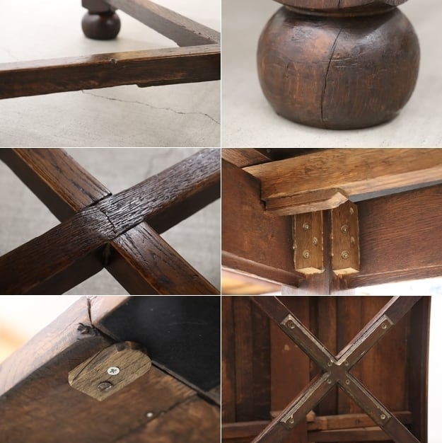 脚の貫裏部分に補強、天板のツヤ感にムラ、全体的に傷や擦れはありますが使用に差し支える様なダメージはありません。