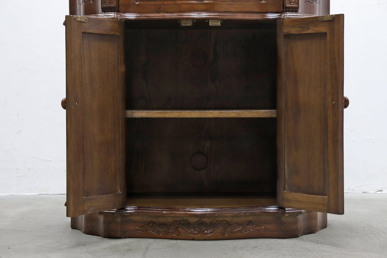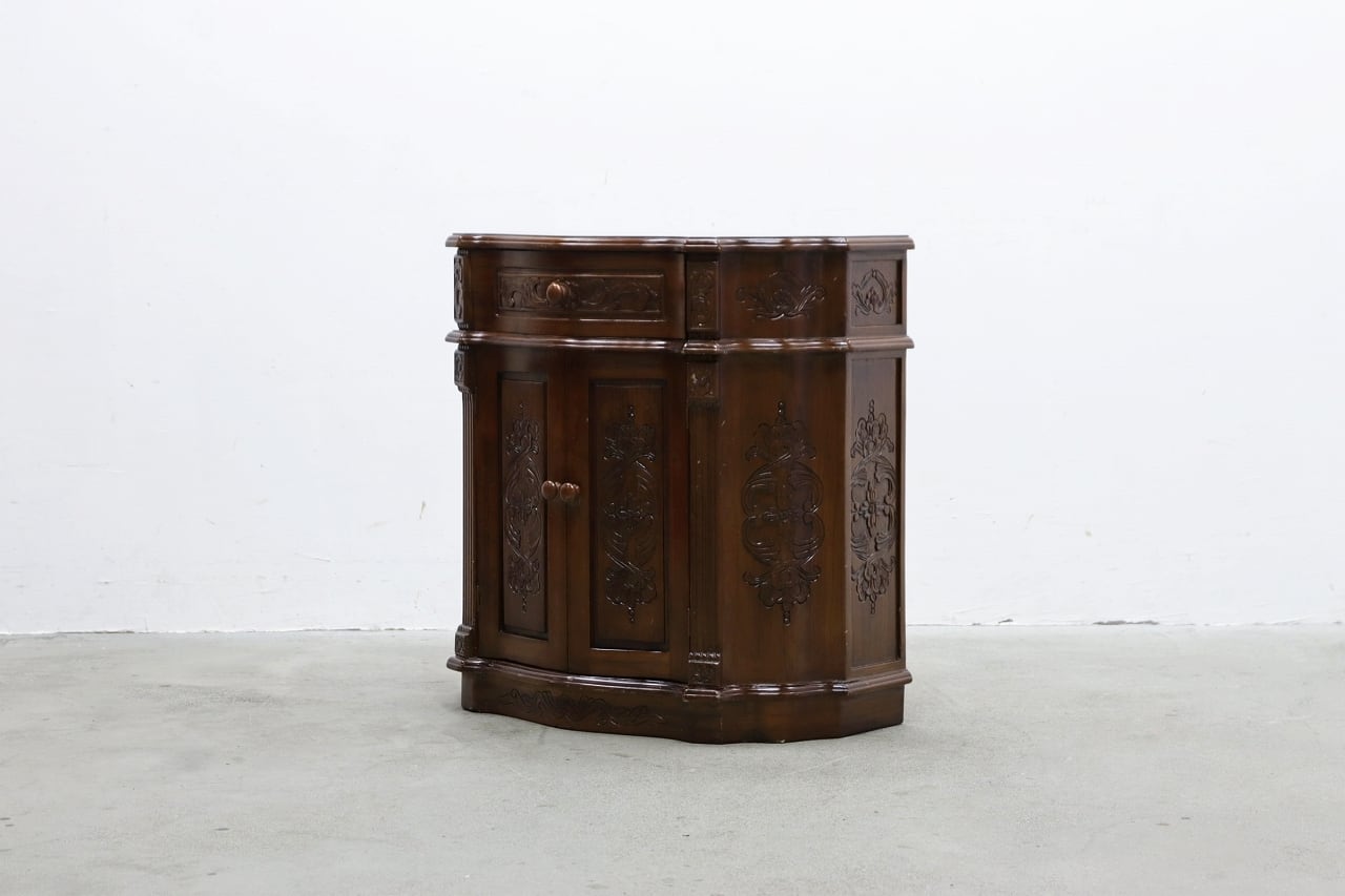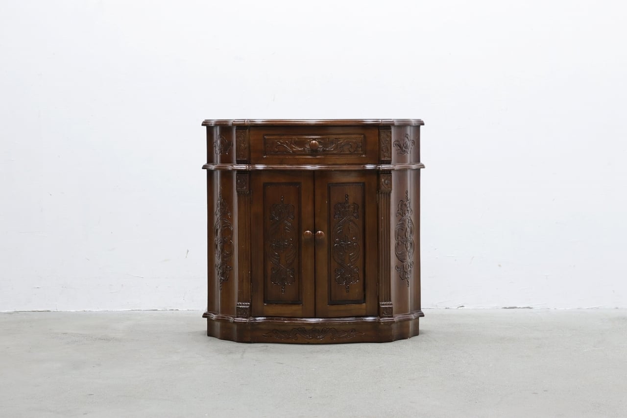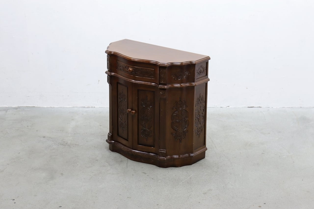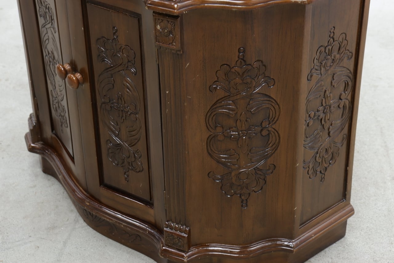 ラウンドした天板と、両サイド、前面の扉に施された豪華な木彫りの装飾が印象的。