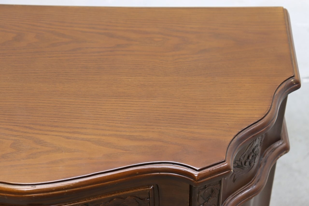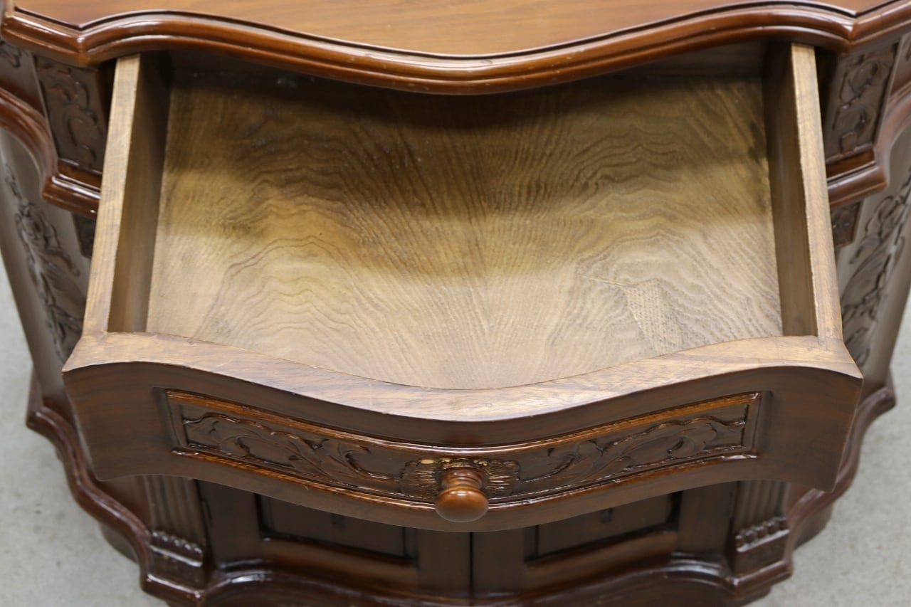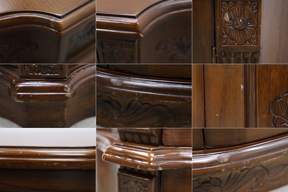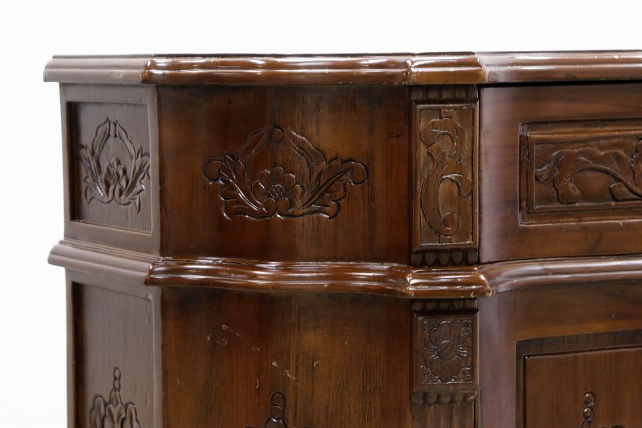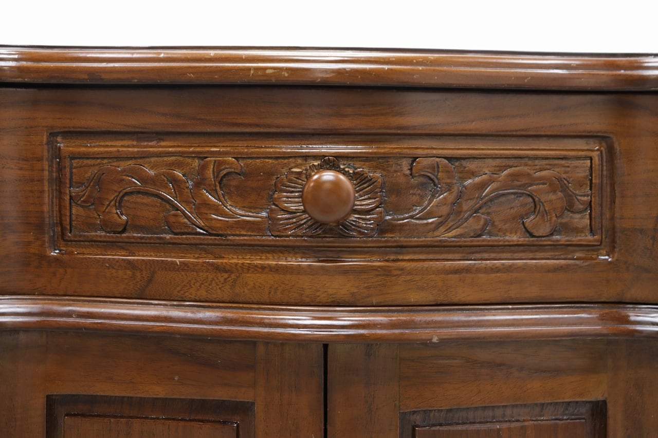 ラウンドした天板と、両サイド、前面の扉に施された豪華な木彫りの装飾が印象的。