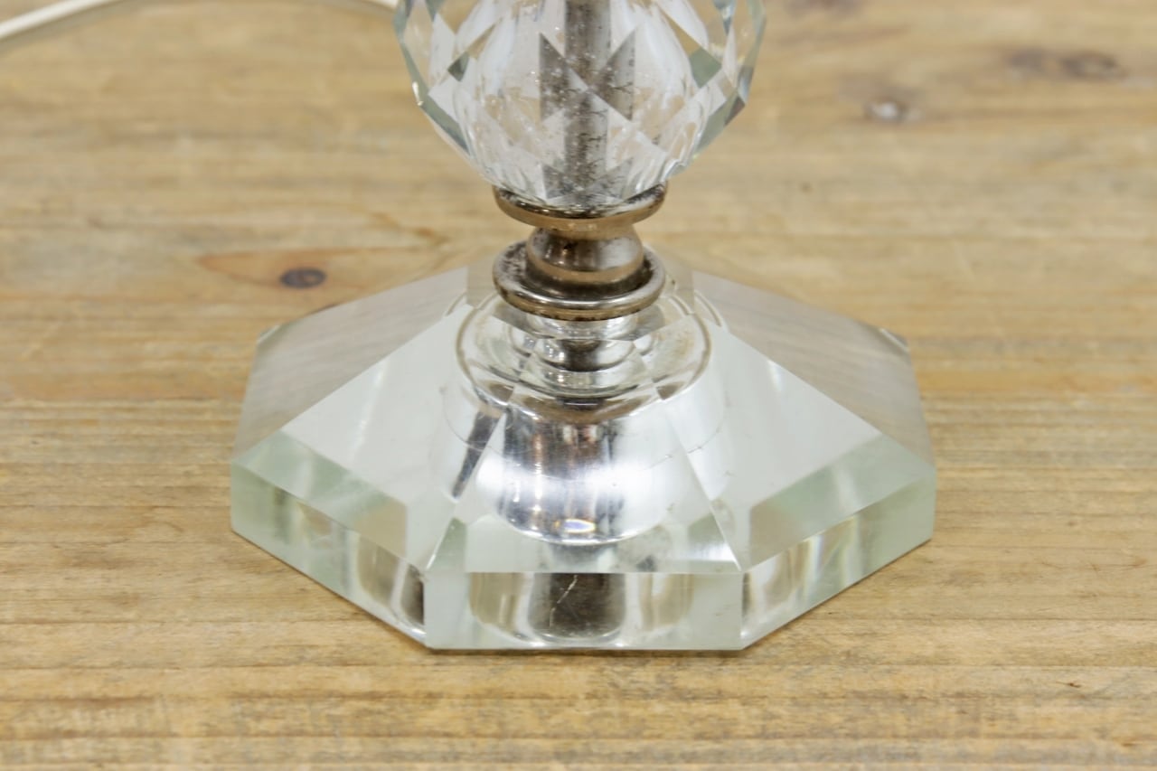 台座中央の大きなカットクリスタルが光を美しく反射し、アイボリー色のシンプルなファブリックシェードが優しく光を拡散します。
