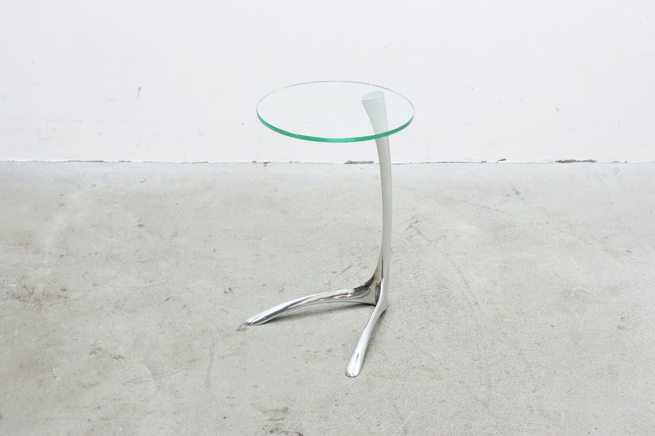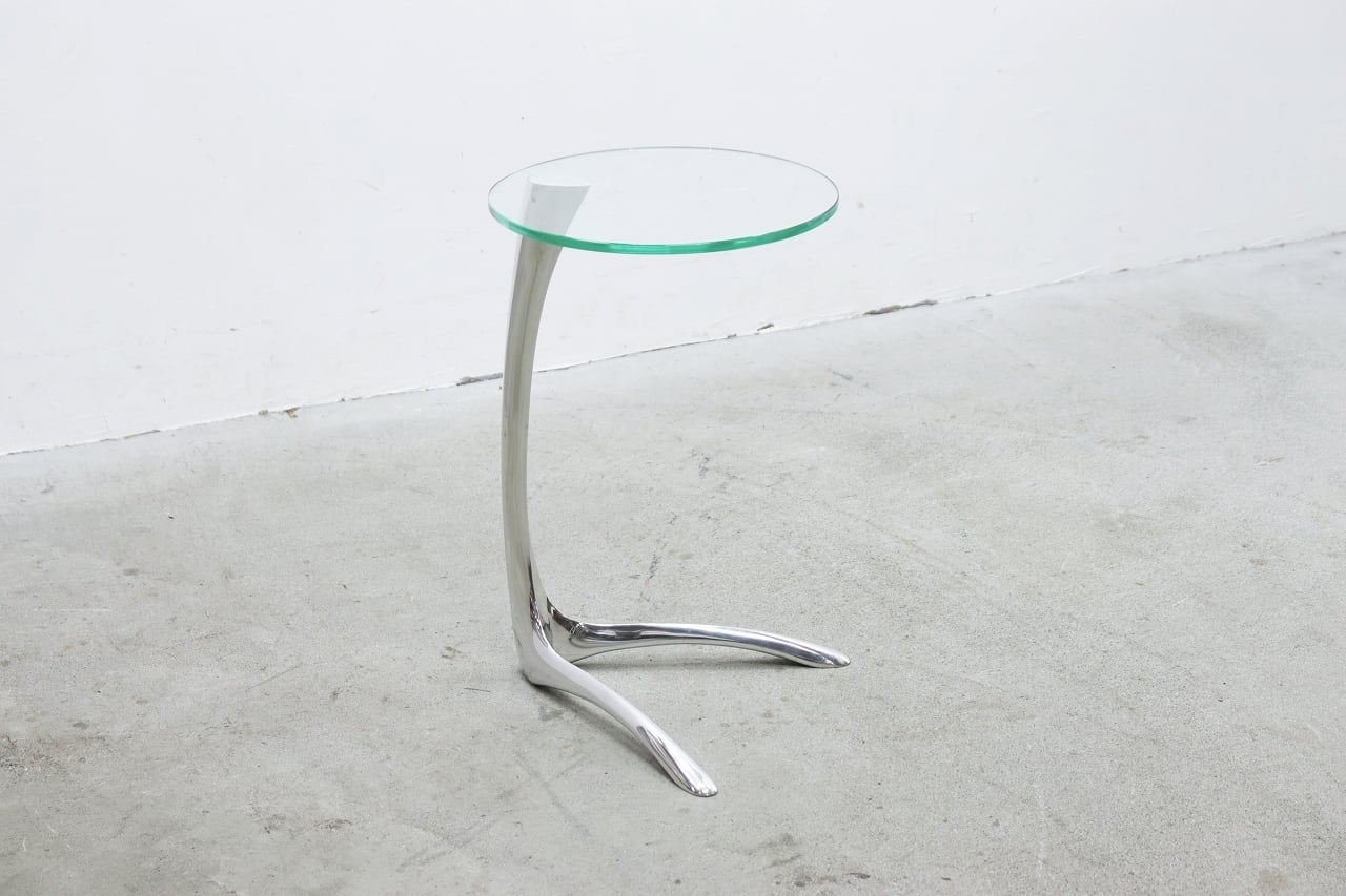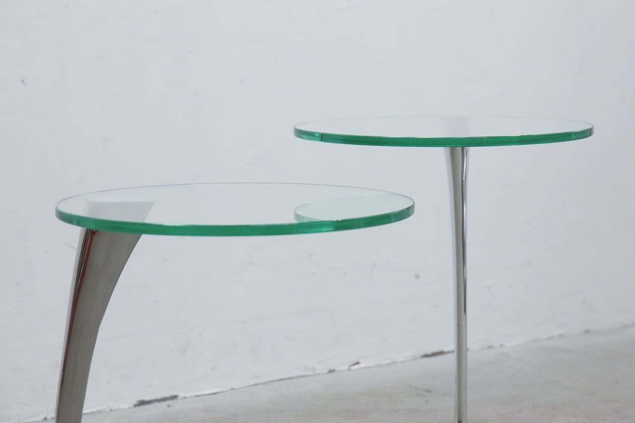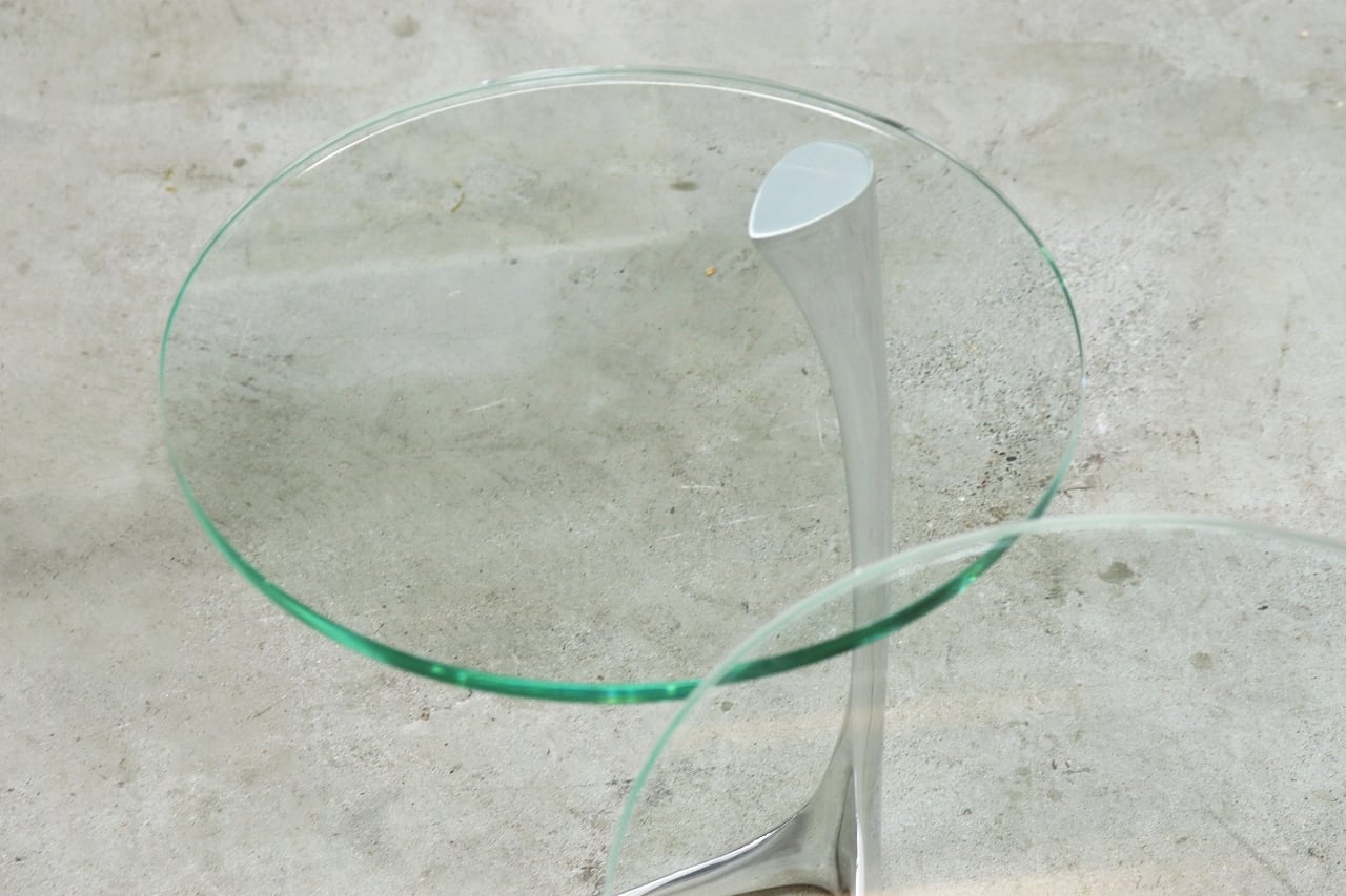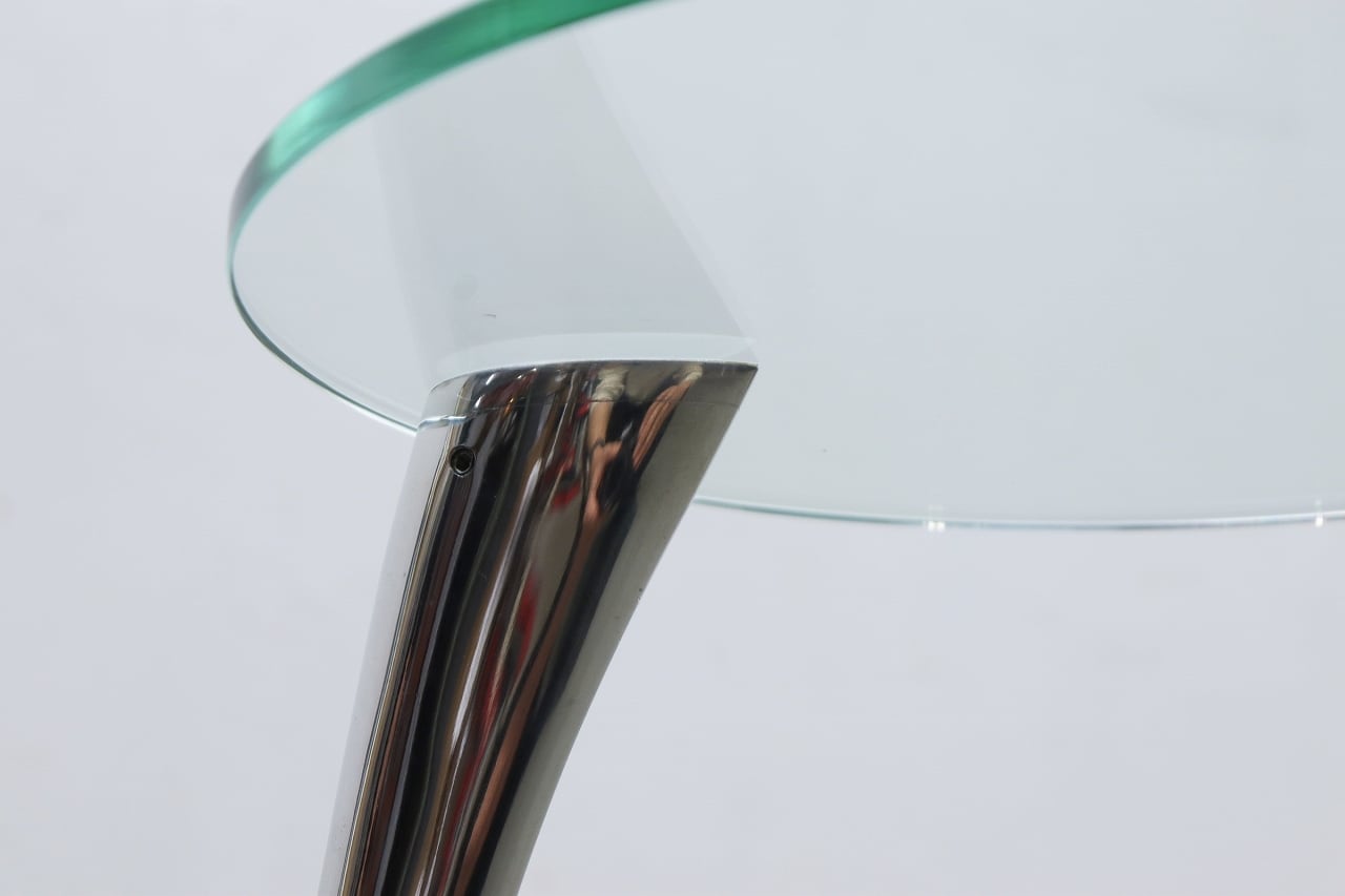 流れるような曲線を描くクローム仕上げの脚部と、透明感のある円形ガラストップが印象的。