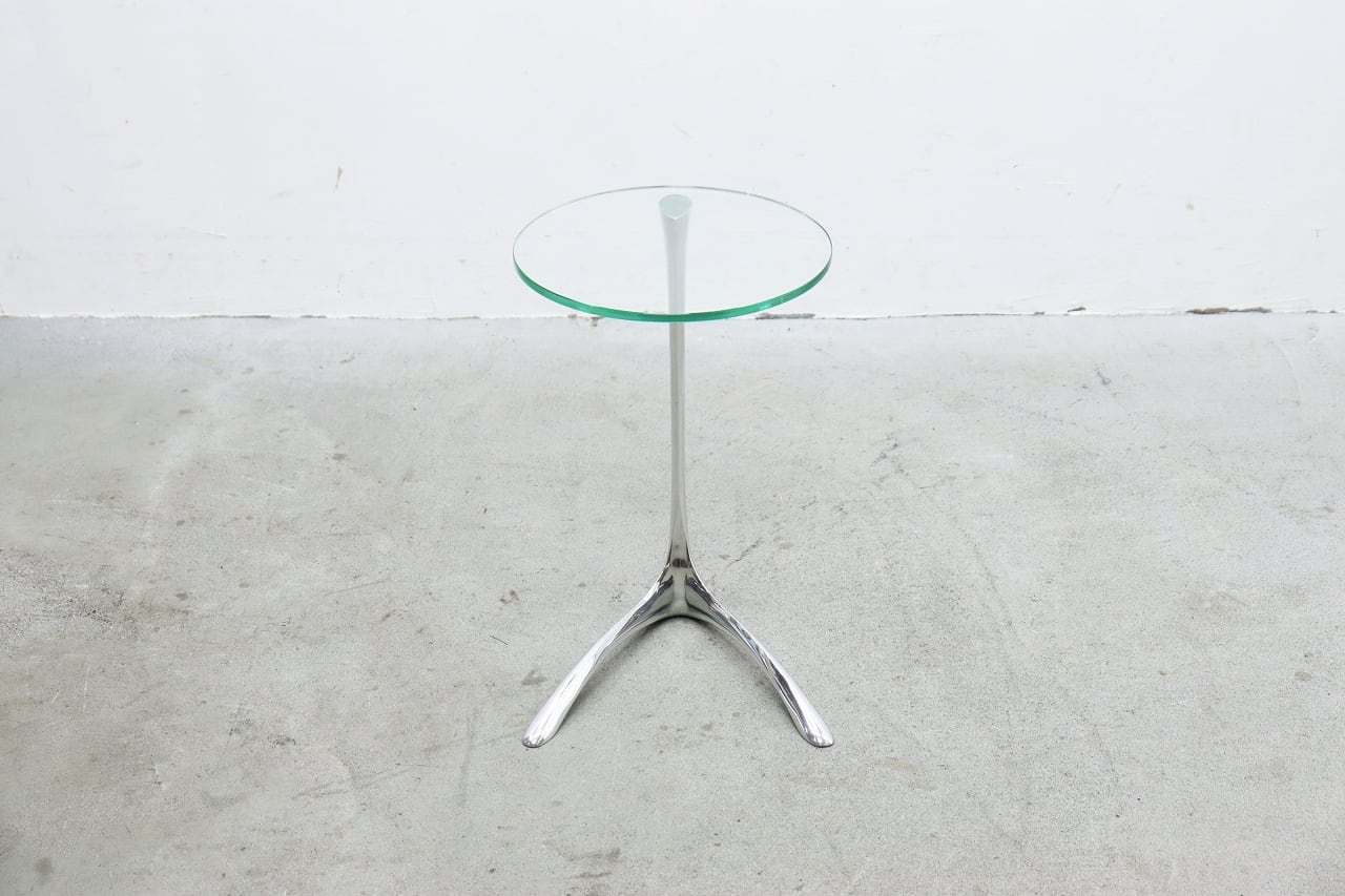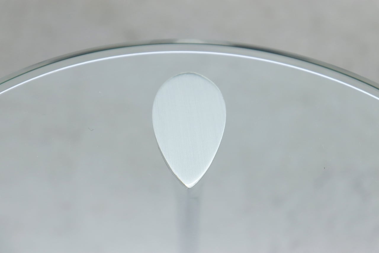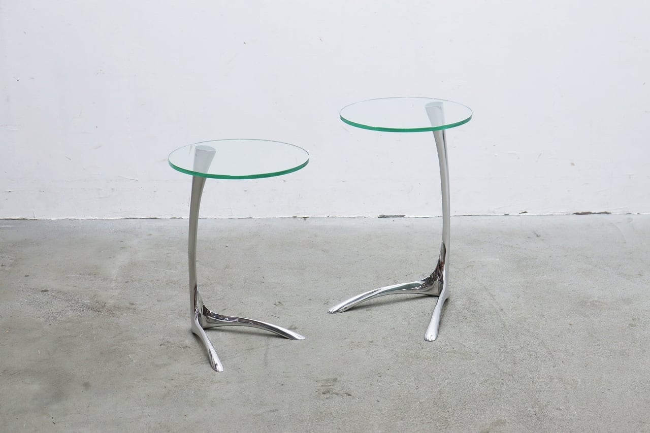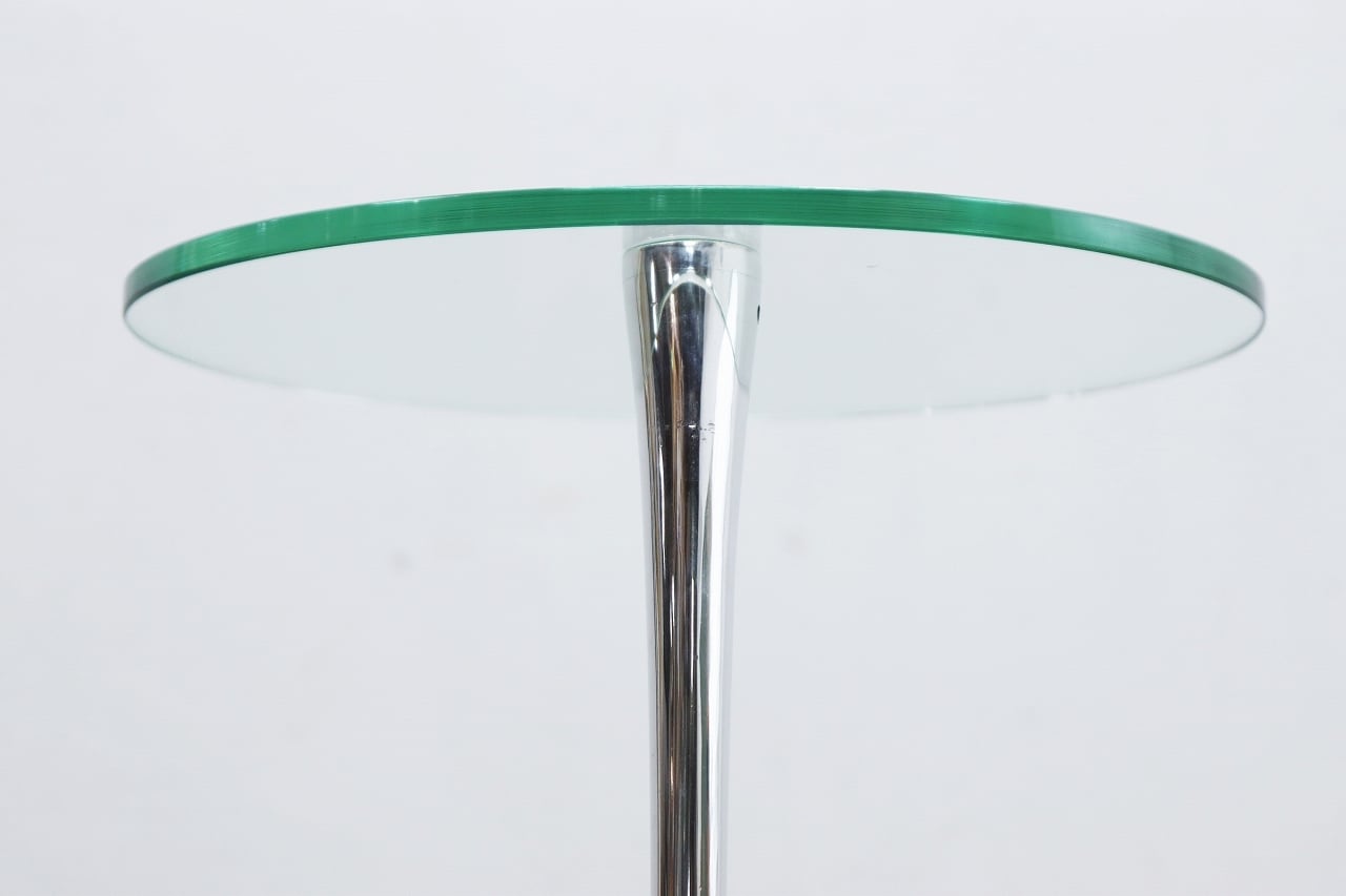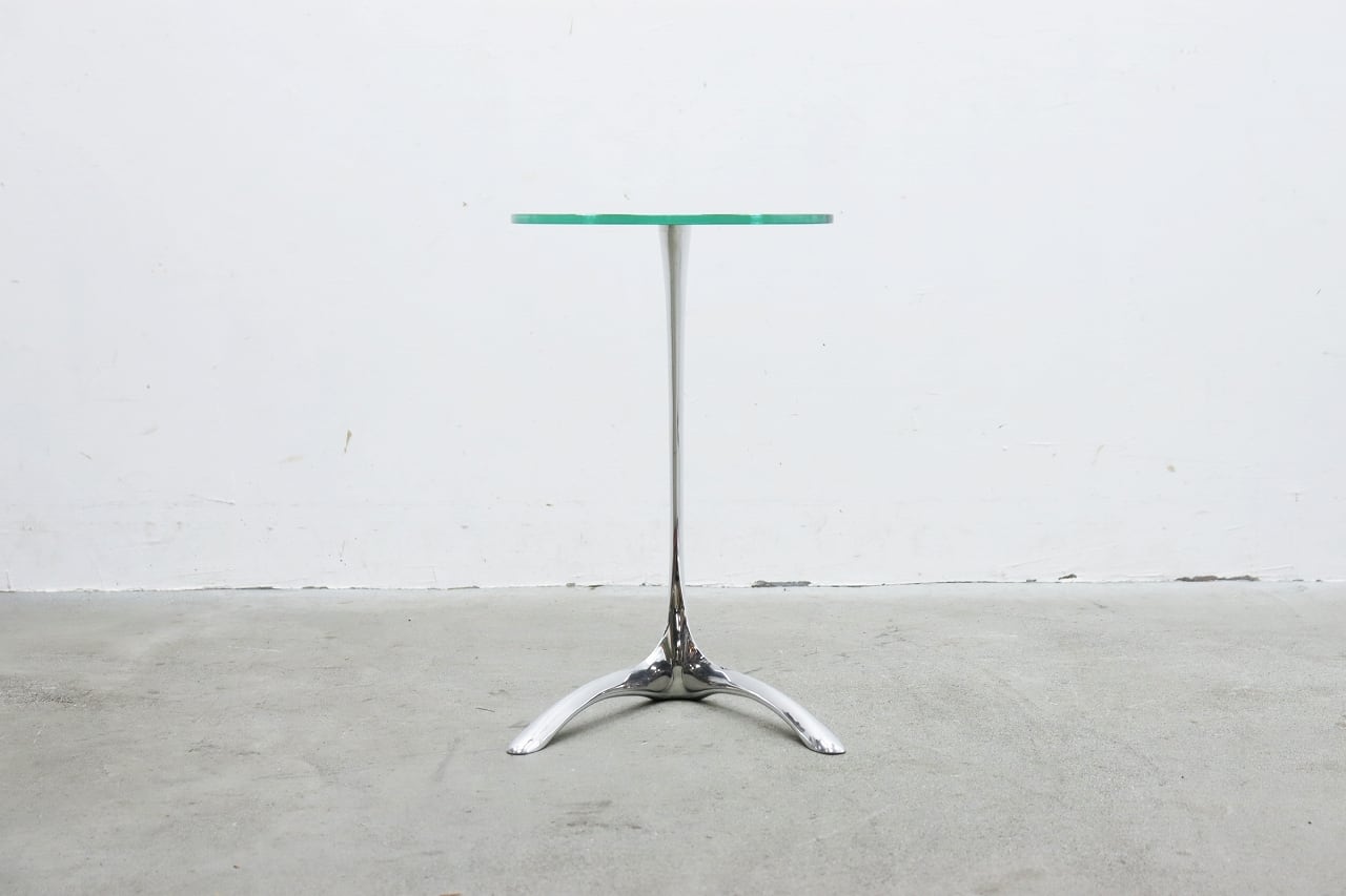 流れるような曲線を描くクローム仕上げの脚部と、透明感のある円形ガラストップが印象的。