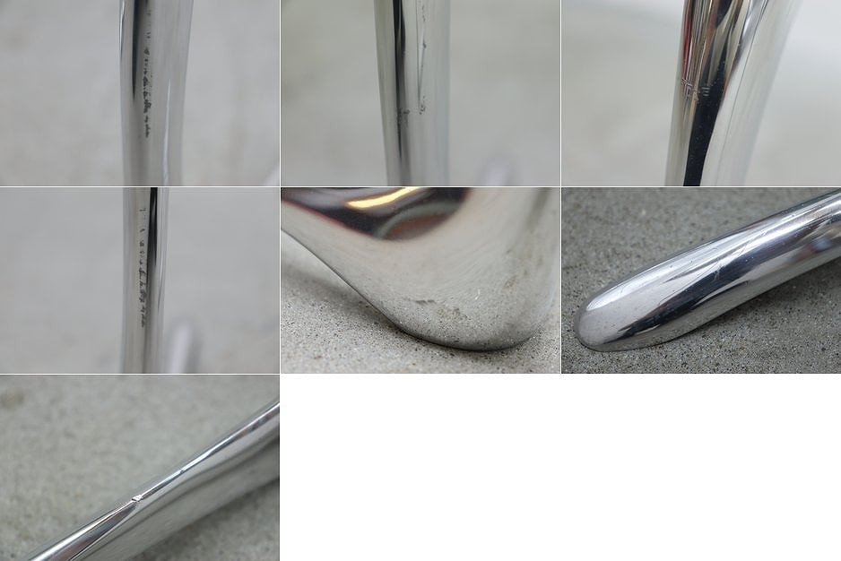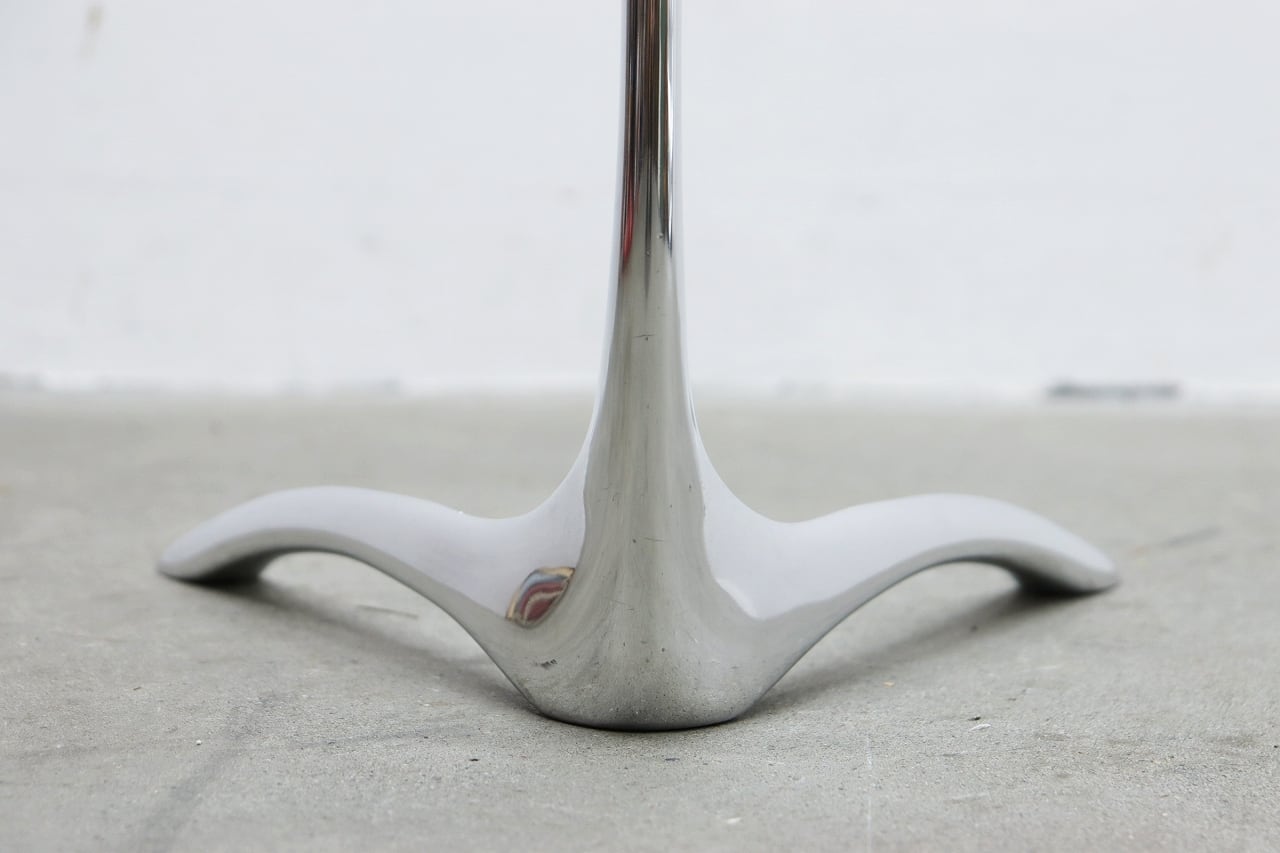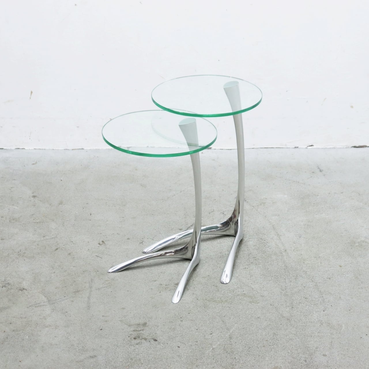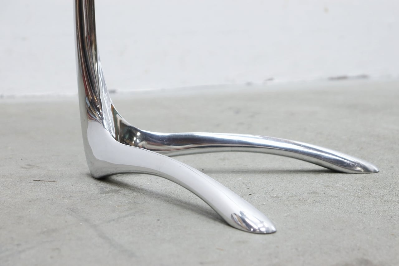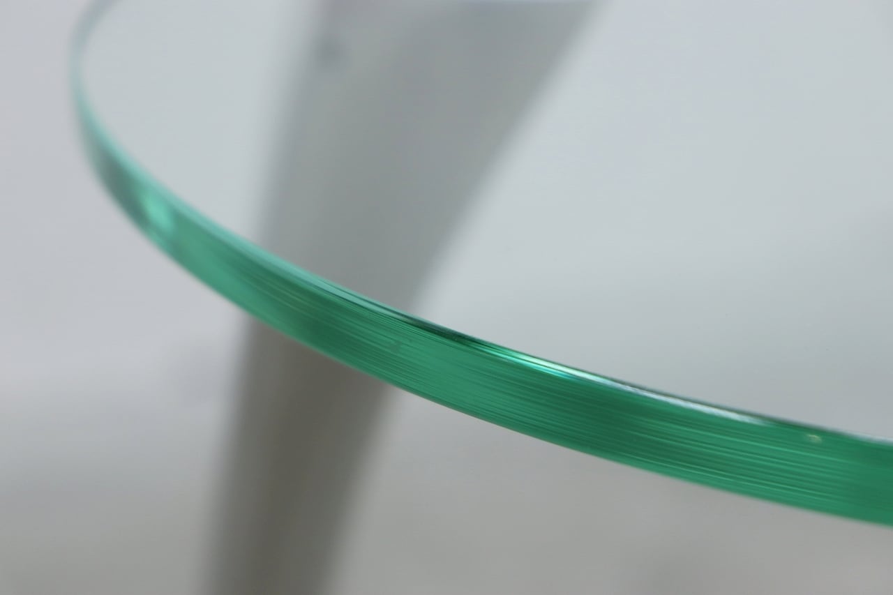 流れるような曲線を描くクローム仕上げの脚部と、透明感のある円形ガラストップが印象的。