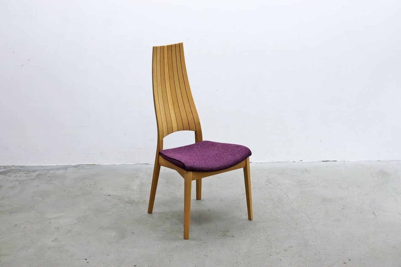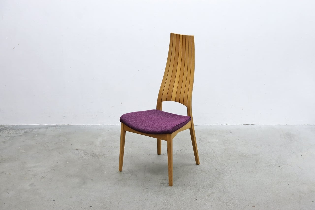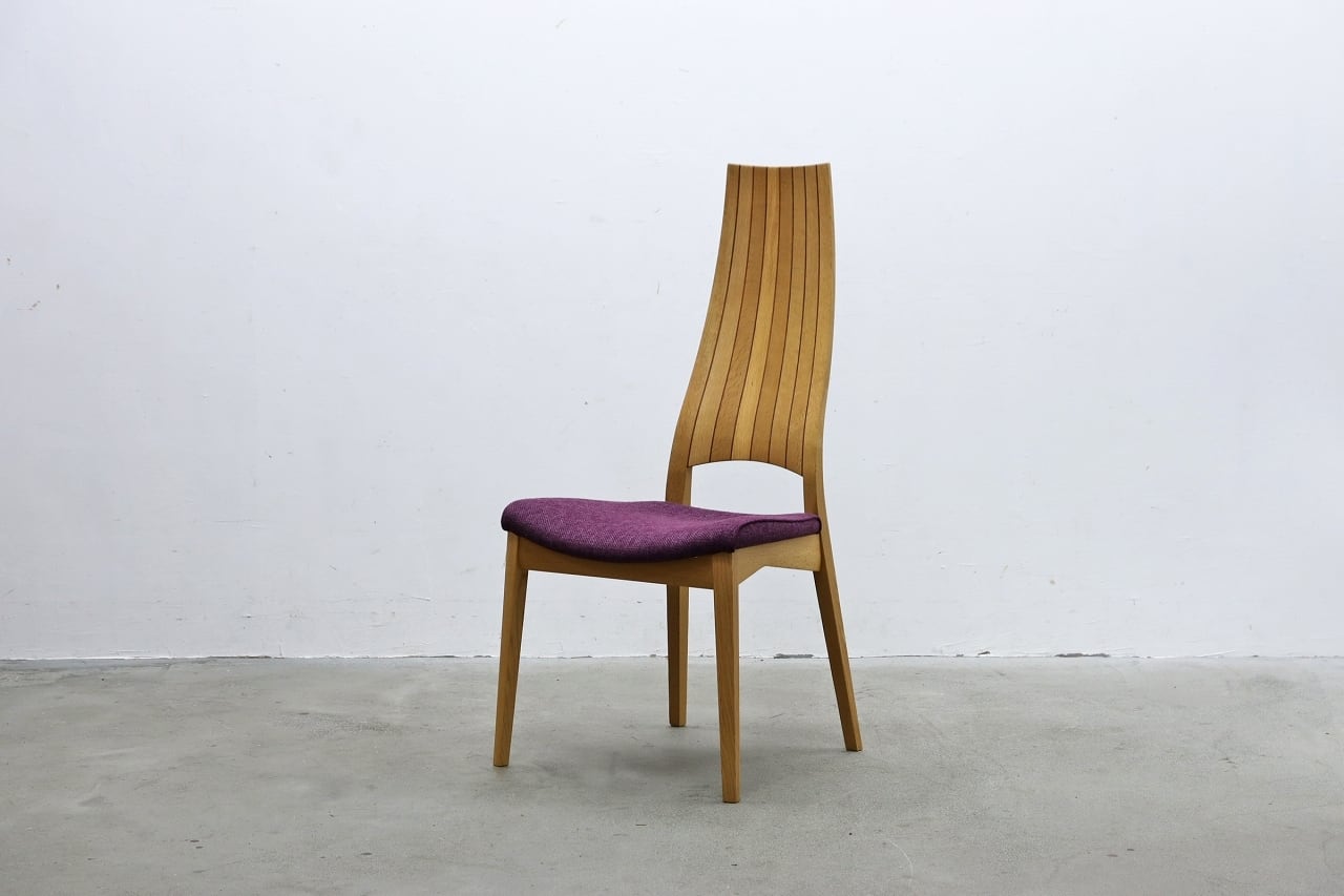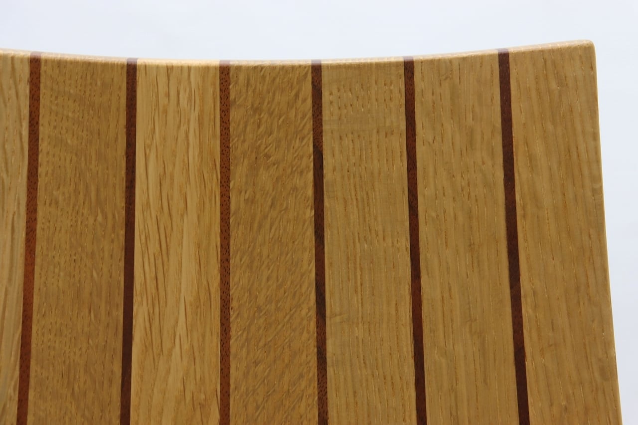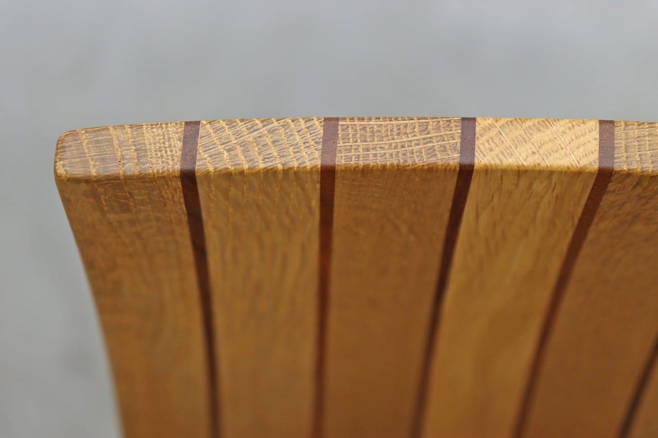 花弁をモチーフとした優美なラインの背もたれは、 オーク材でブラックウォールナット材を挟むことにより縦に伸びるラインを強調。