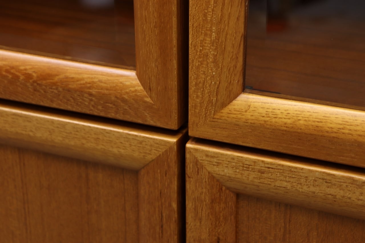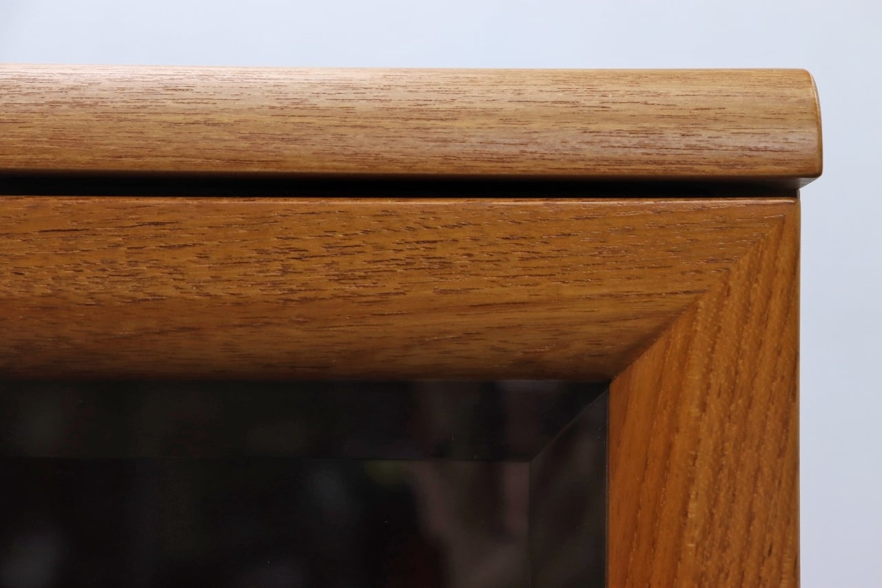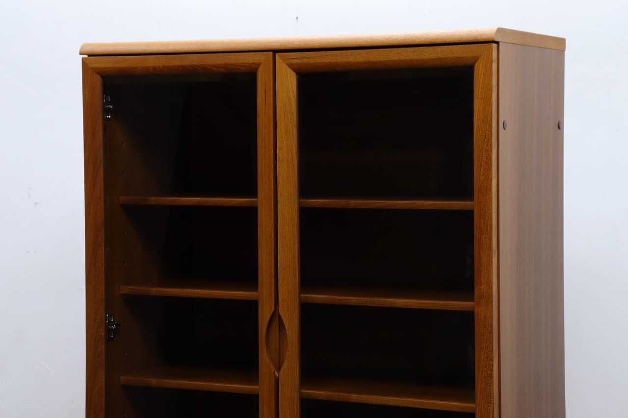 上段にはガラス扉を配し、内部の棚板が奥行きを感じさせながら、器や書籍、コレクションを美しく引き立てます。