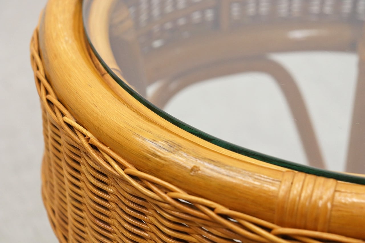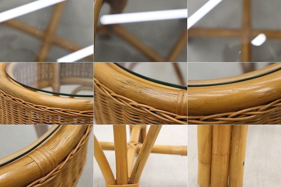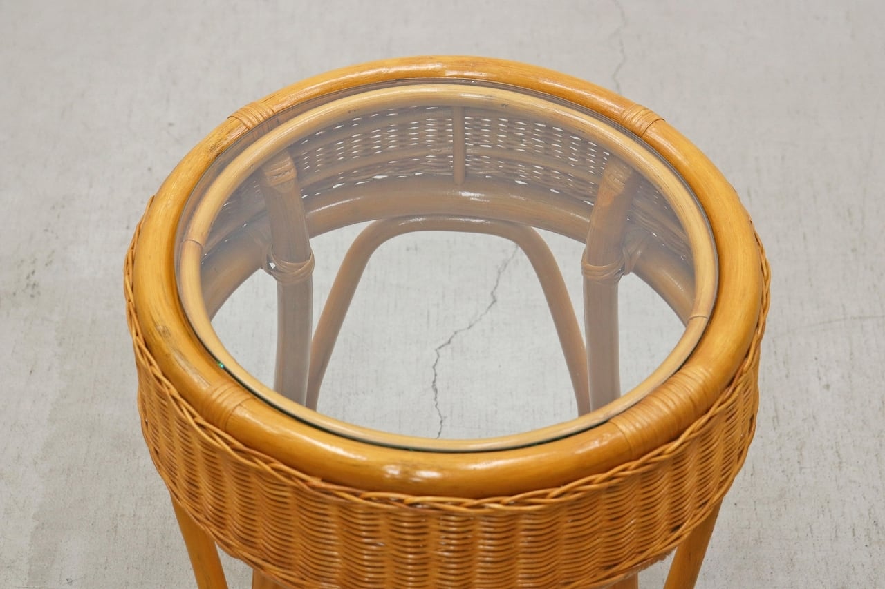 【沼津店】レトロ ラタン 籐 ガラス サイドテーブル ラウンド 円型 花台 ラック ヴィンテージ PLT23151