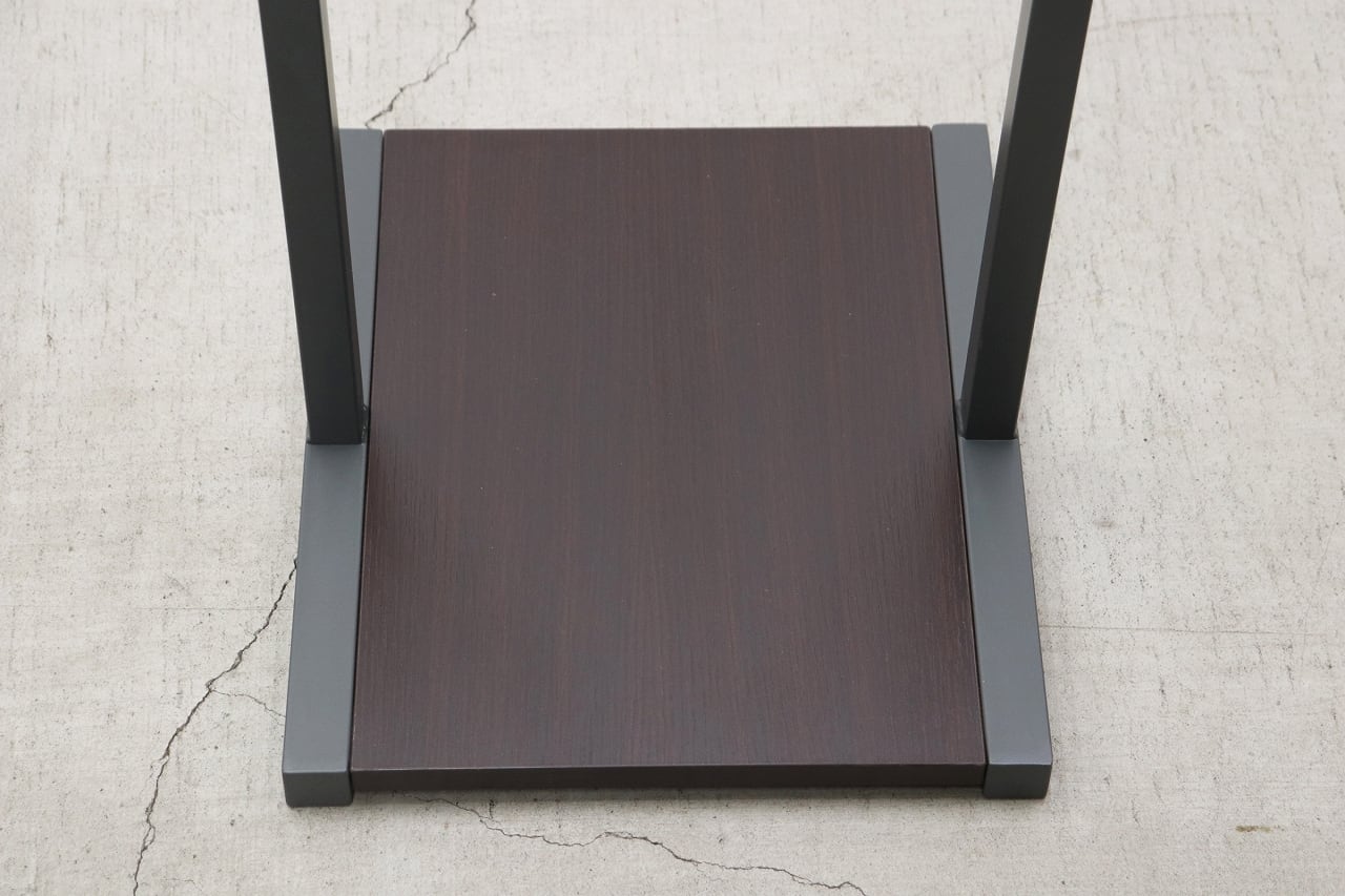グレーのスチールフレームにダークブラウンの棚板を組み合わせた、落ち着いた雰囲気のハンガーラック。