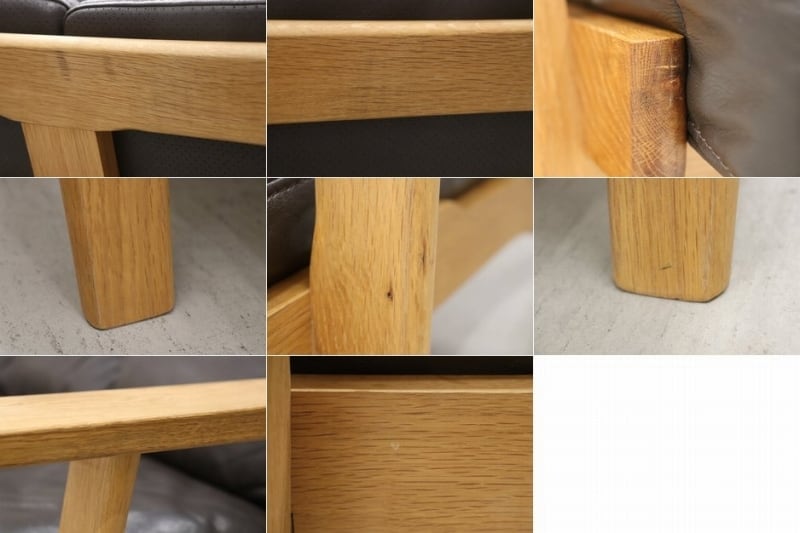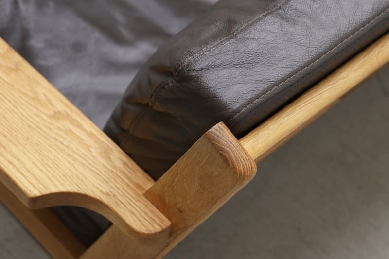 直線的で端正なオーク無垢材フレームに、本革シートを組み合わせた上質な佇まいが魅力。