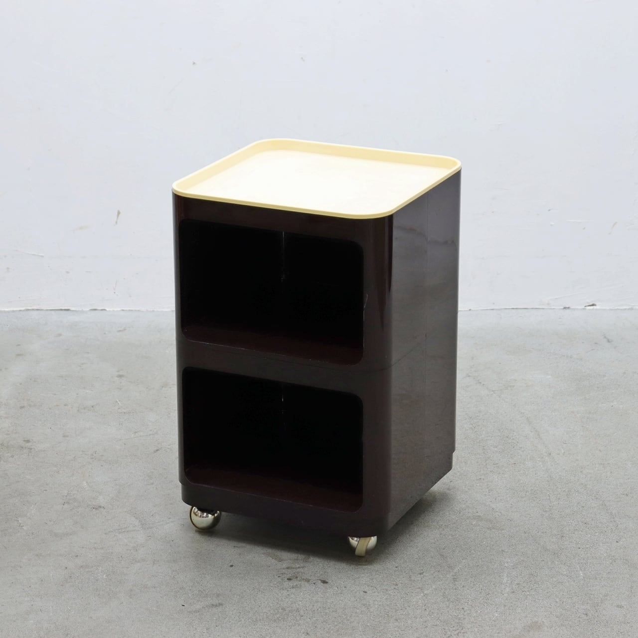 着いたブラウンカラーが印象的な、プラスチック製の重ね式収納ユニット。