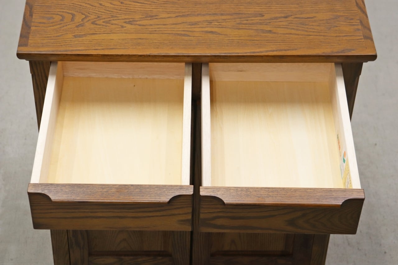 上段に引き出しが2杯、下段は観音扉収納が備えられており、用途によって使い分けが可能。