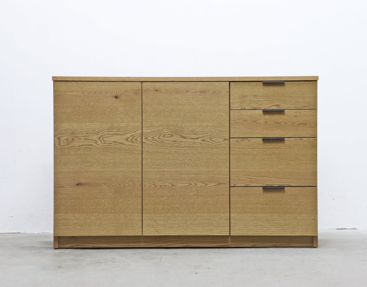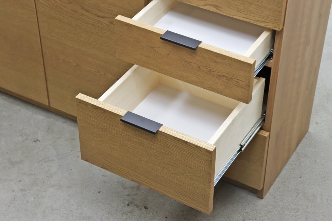 扉収納と引き出しを組み合わせた実用的な構成で、リビングやダイニングまわりの小物、書類、カトラリー類など