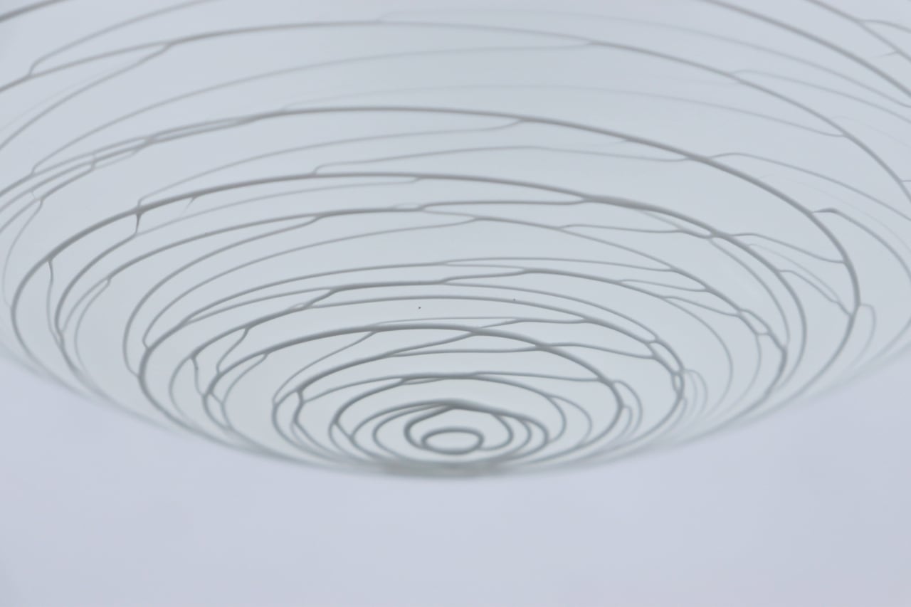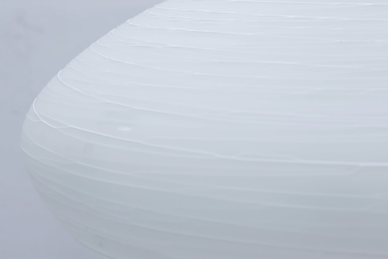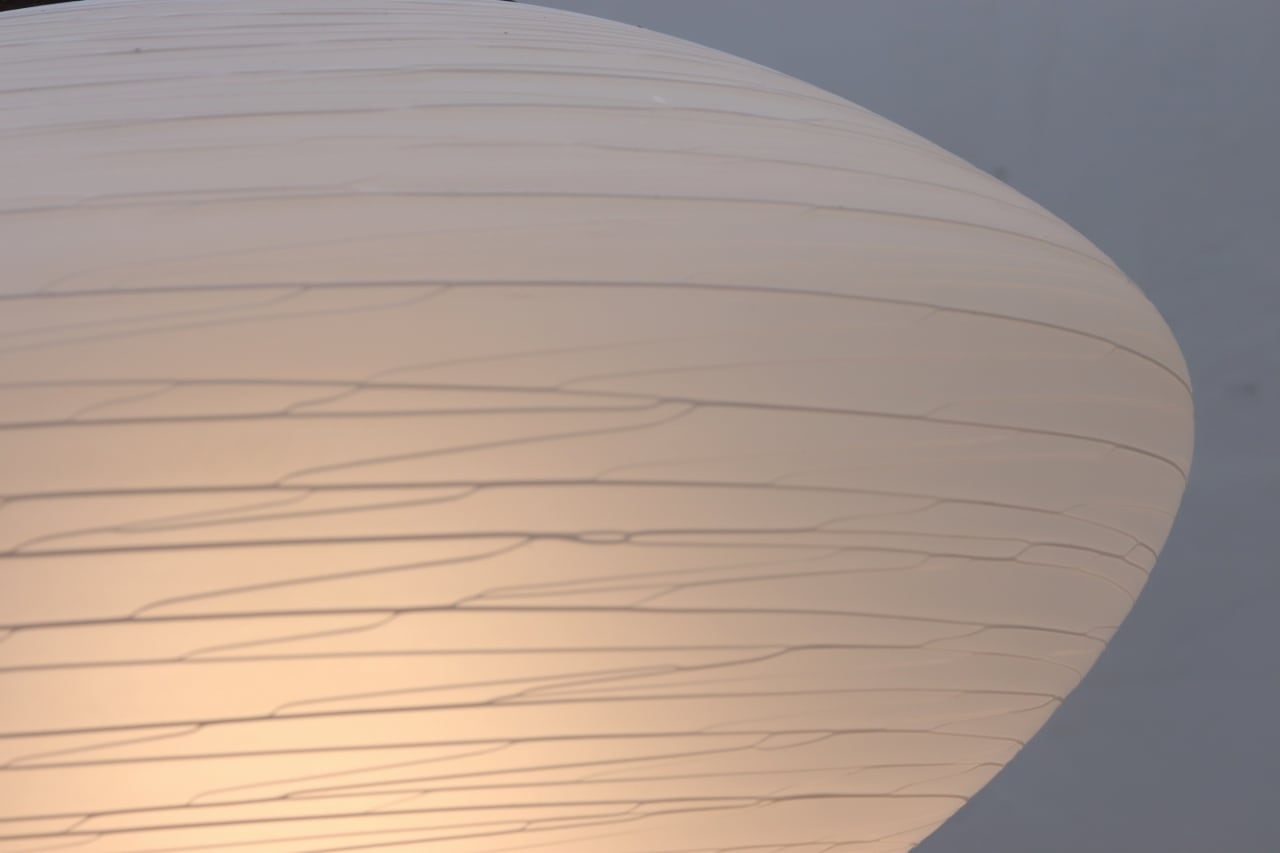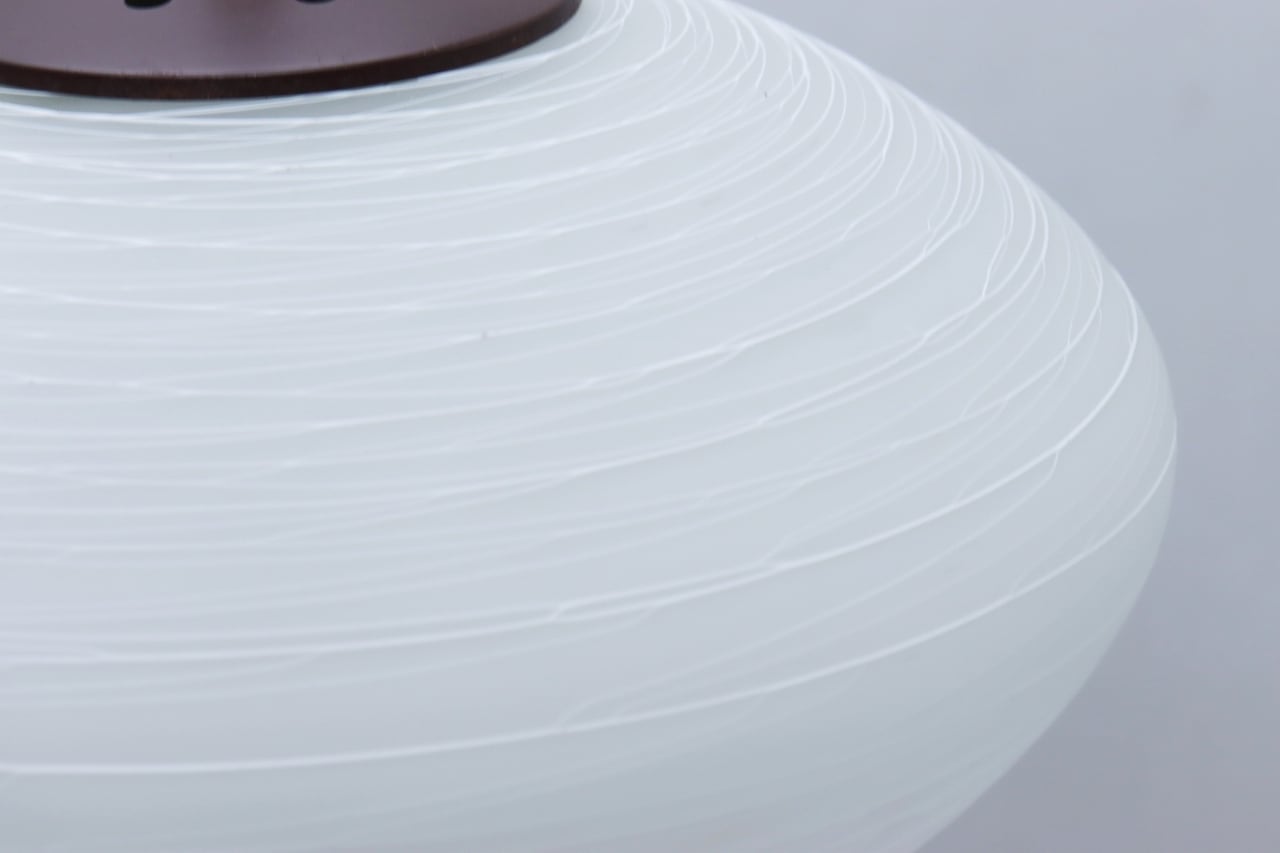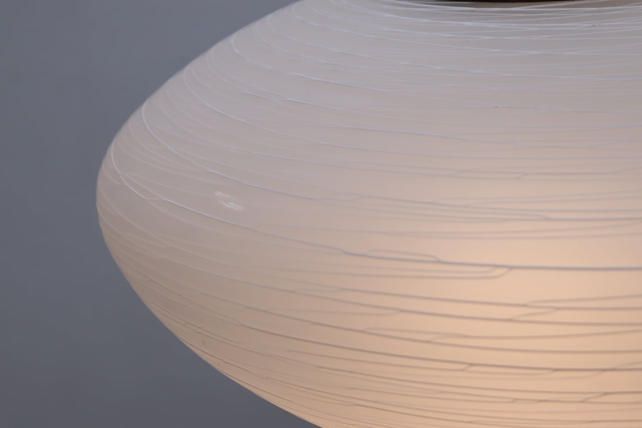 白色ガラスを糸の様に伸ばしながらシェードに巻き付ける手法で作られており、