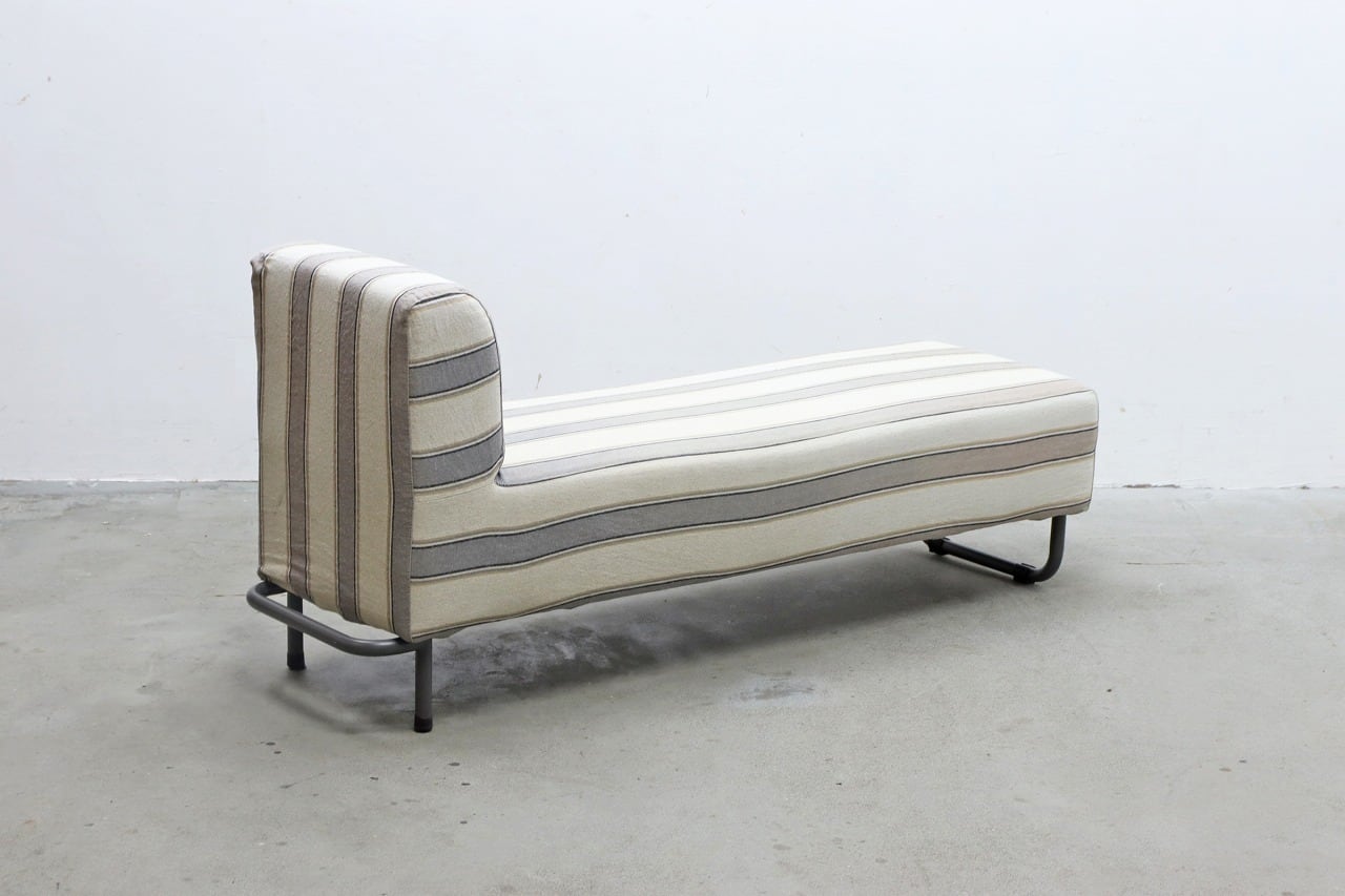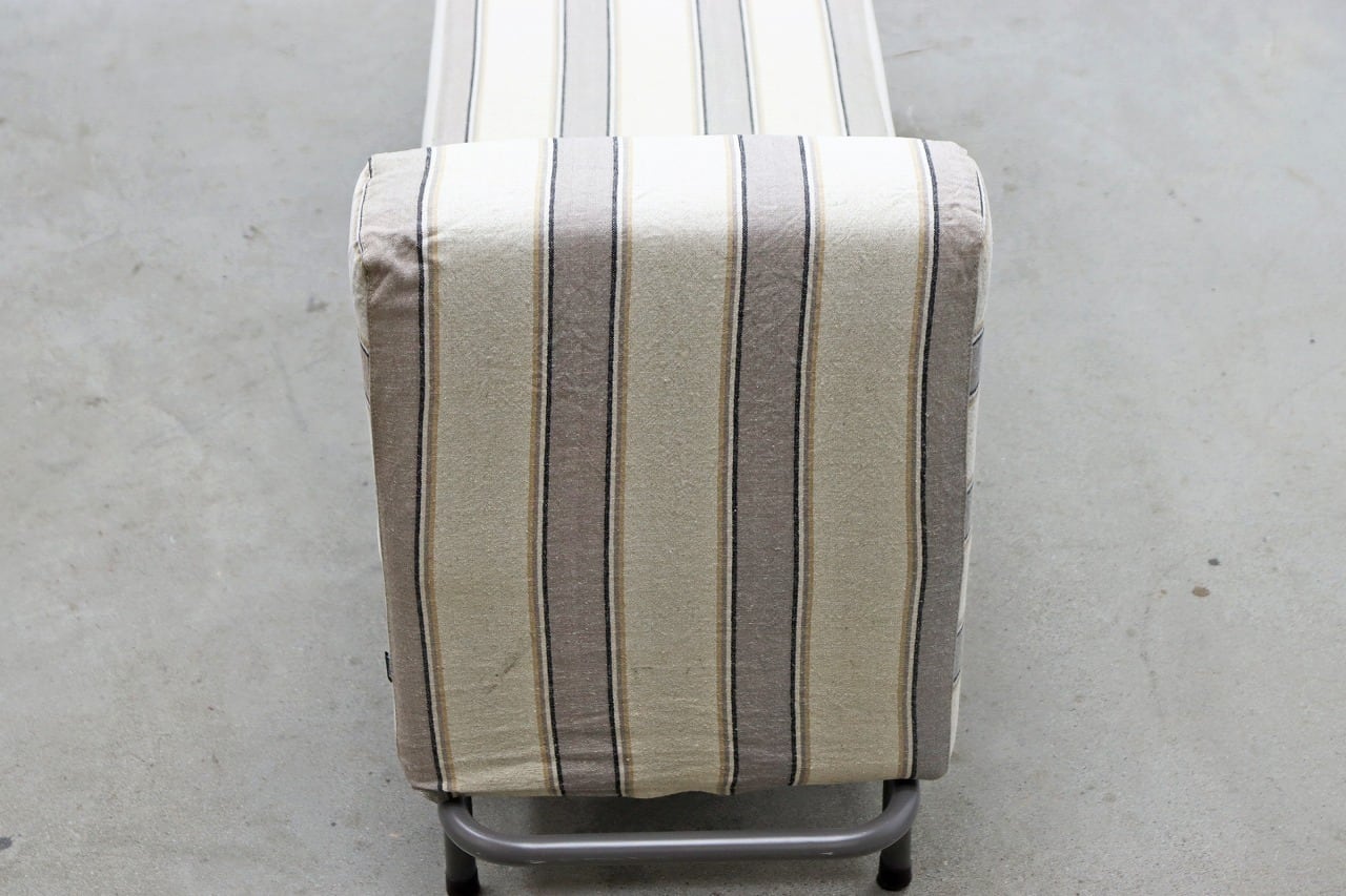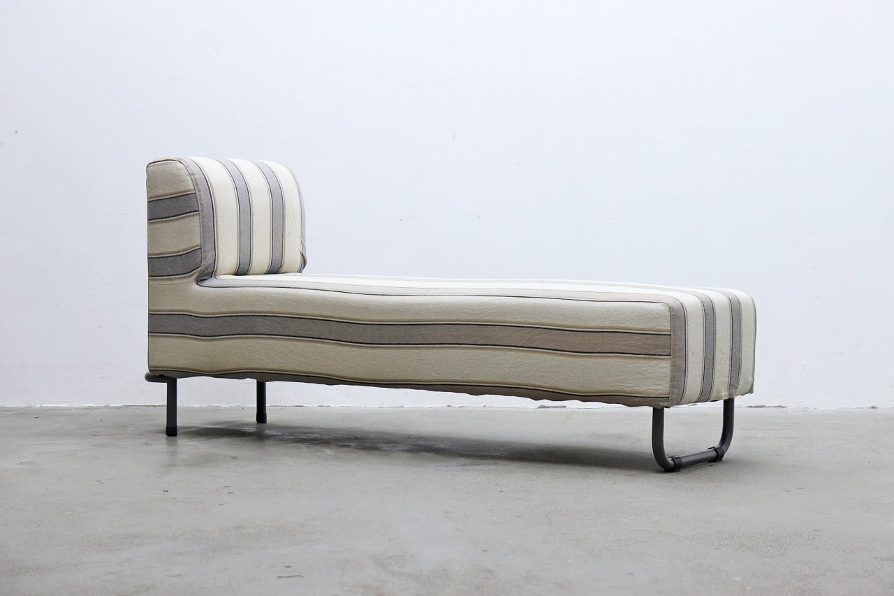 片側に背もたれを設けたすっきりとしたフォルムに、ブラックのスチール脚を合わせた軽やかなデザイン。