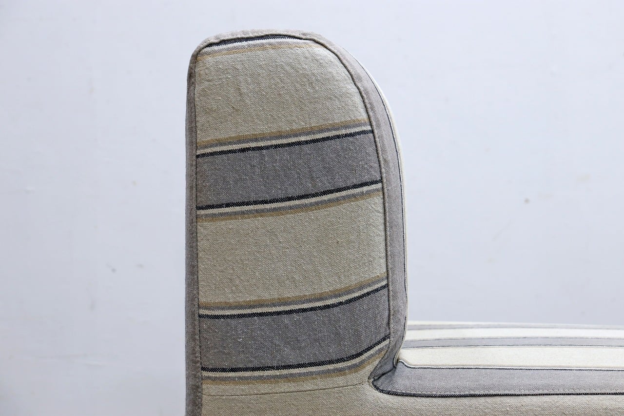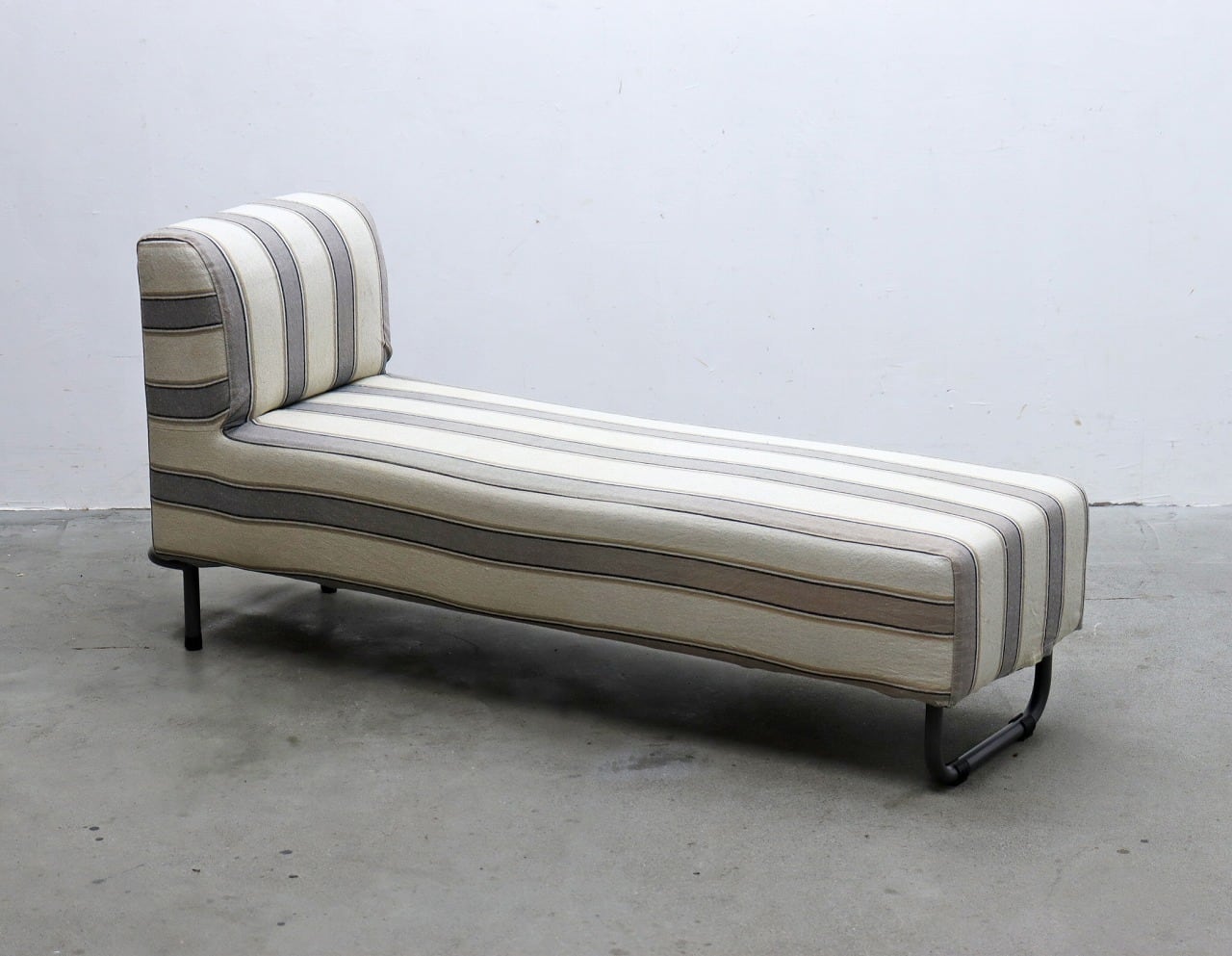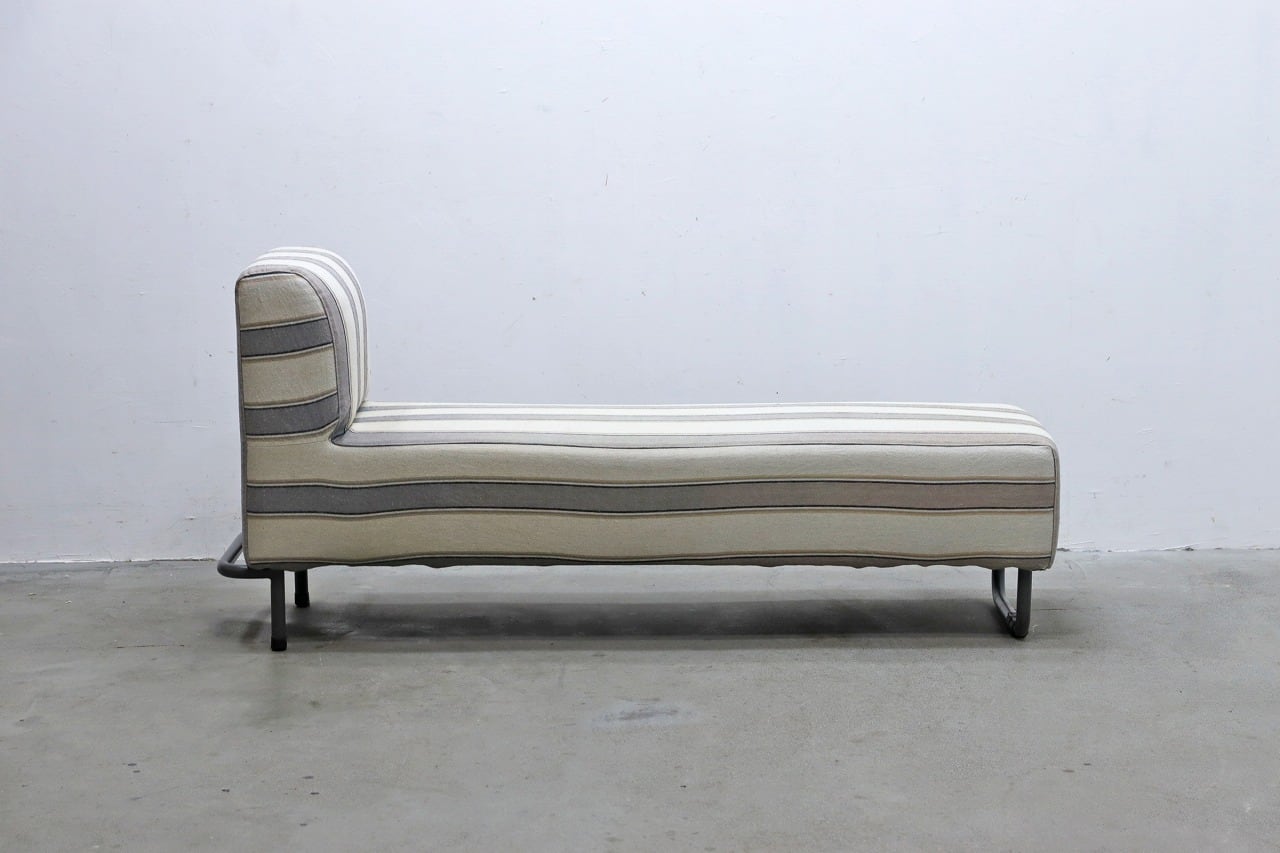 片側に背もたれを設けたすっきりとしたフォルムに、ブラックのスチール脚を合わせた軽やかなデザイン。