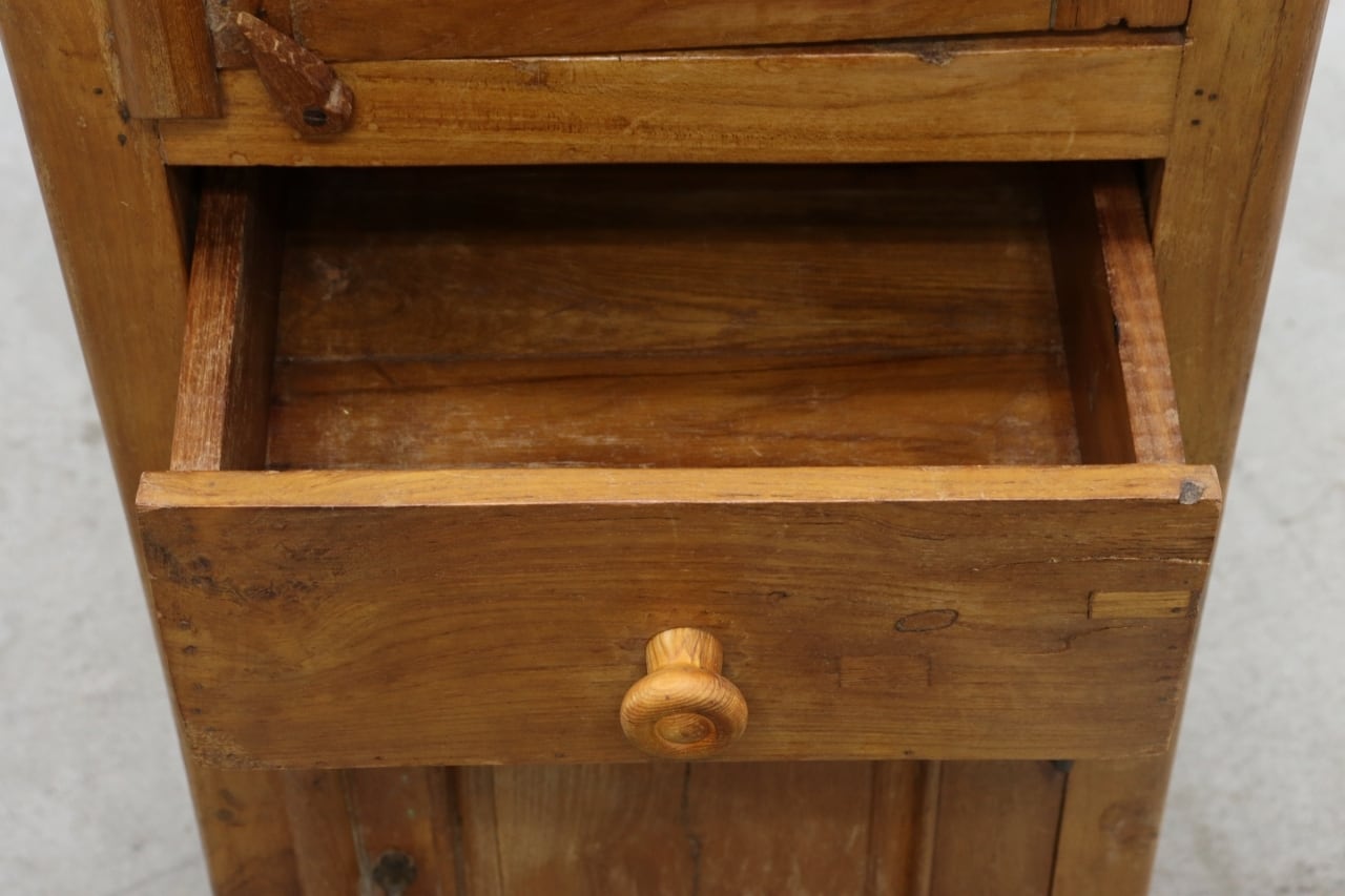 中央には小ぶりな引き出し、下部には収納力のある扉収納を備え、見せる収納と隠す収納をバランス良く使い分けられる実用的な構造となっています。