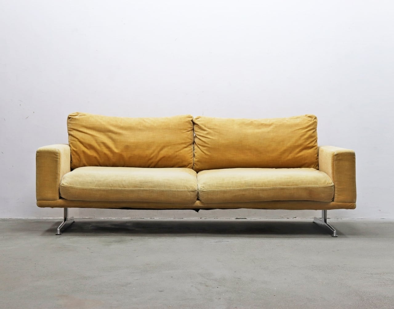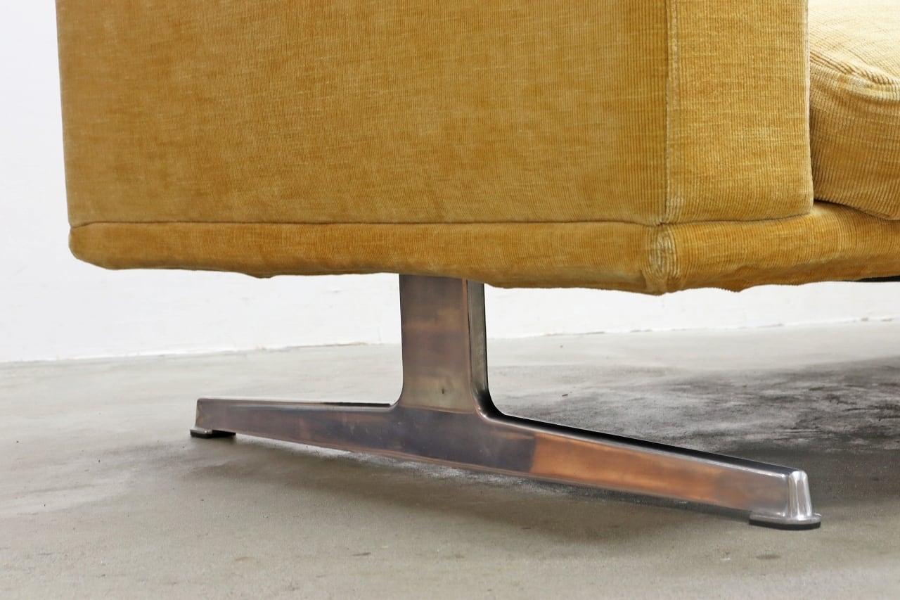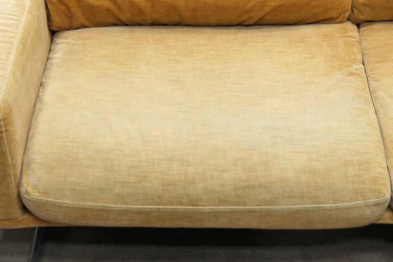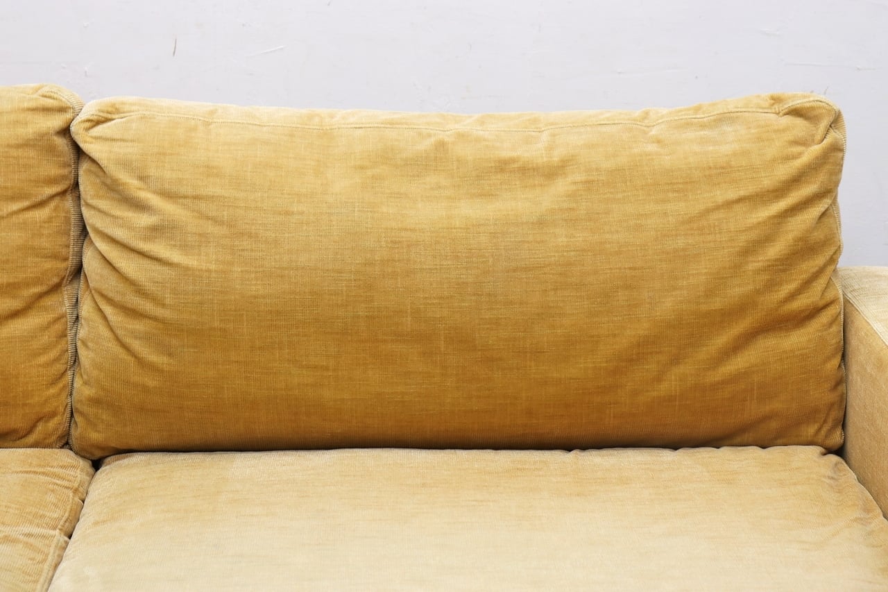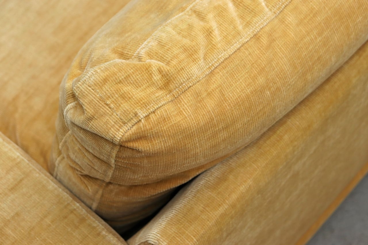 あたたかみのある淡いマスタード色のファブリックに、ポリッシュのT字レッグを組み合わせた