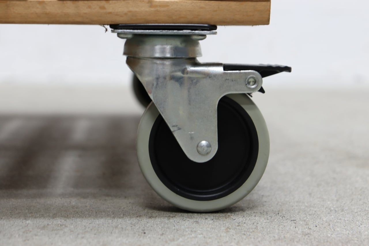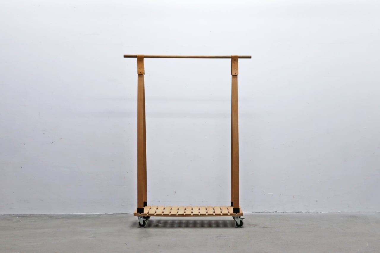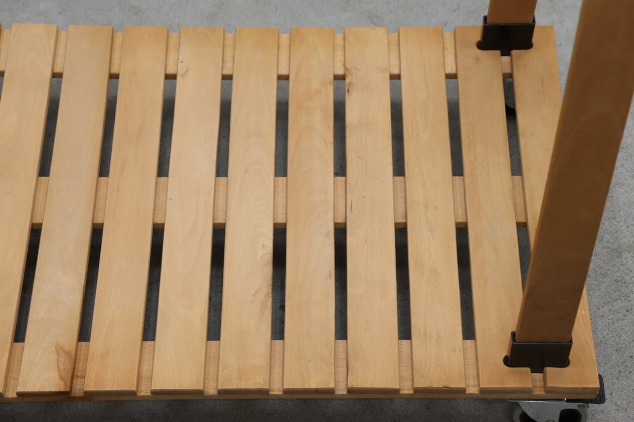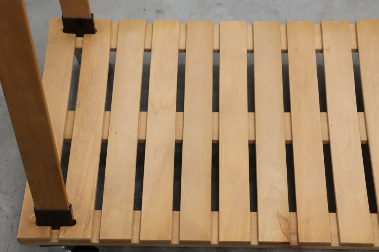 すっきりとしたフレームに、下部はスラット仕様となっており、バッグやボックスを置ける実用的なデザイン。
