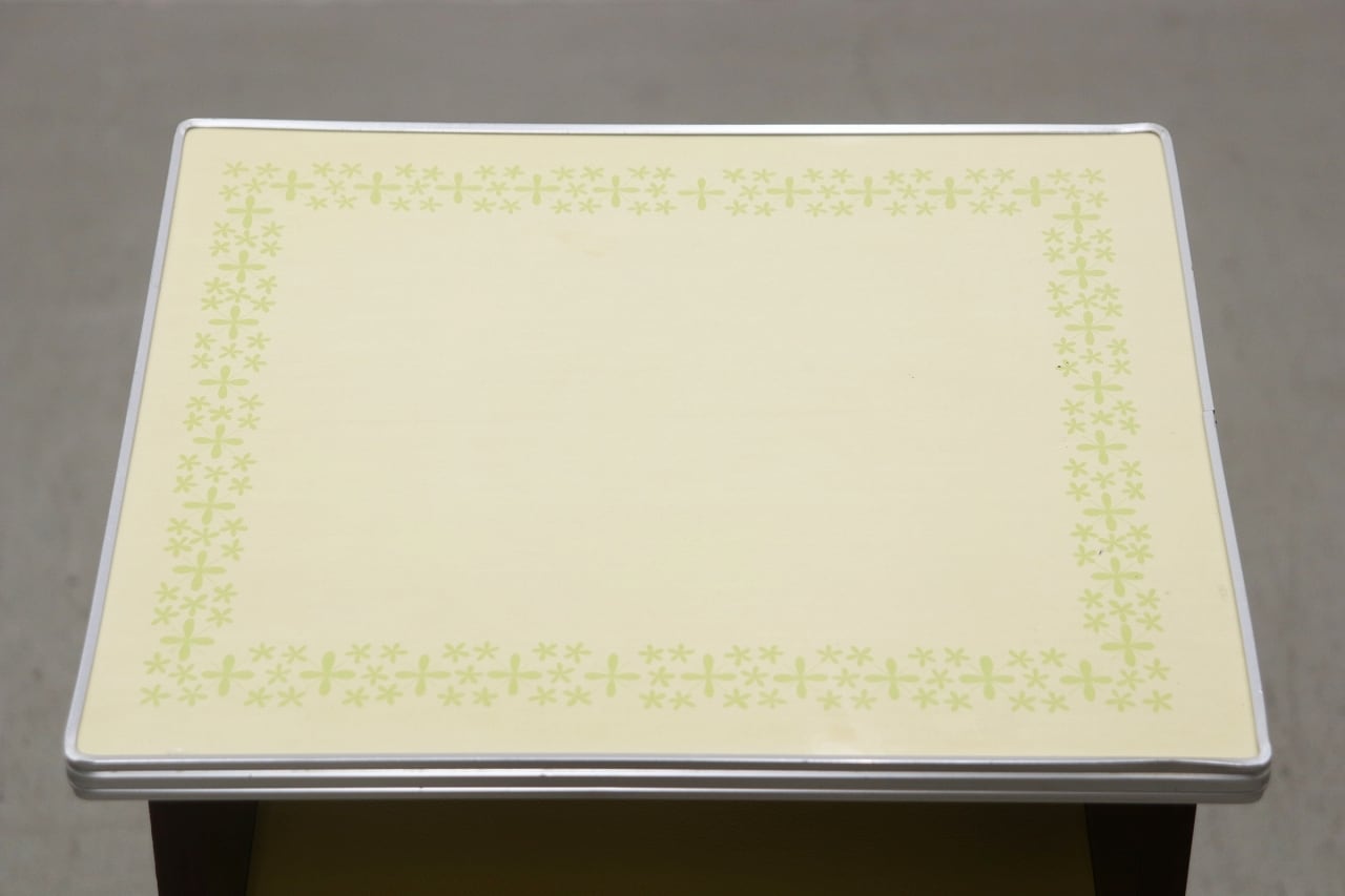 パステルカラーの天板に配された花柄や、デコラティブな取手が印象的。