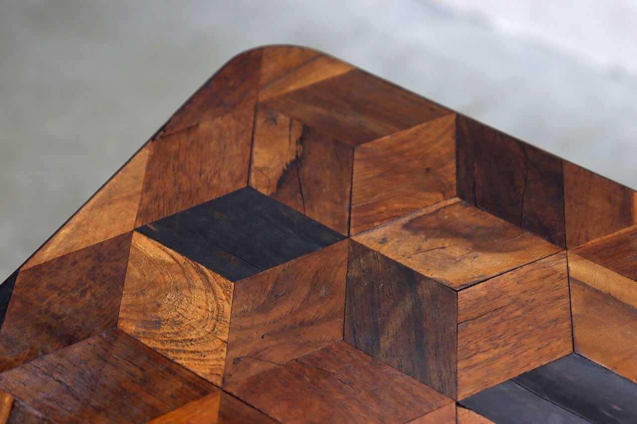 幾何学模様の天板が印象的で、部材毎の濃淡の違いがアクセントとなっています。